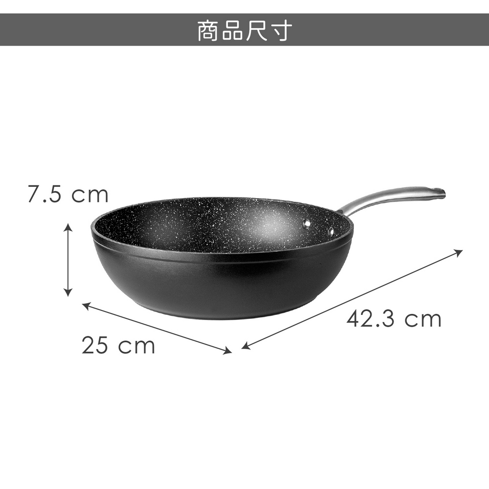 尺寸:含柄長 42.3 x 寬 25 x 高 7.5 cm;內徑 24 cm;底徑約 18.8 cm