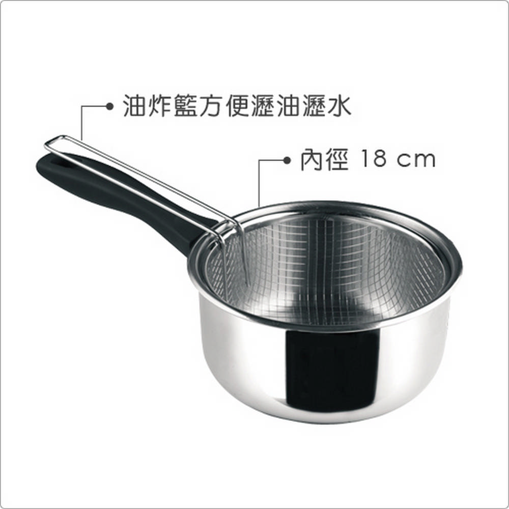 尺寸:鍋含柄長 37.2 x 寬 19.6 x 高 11.7 cm、鍋口內徑 18 cm;濾杓含柄長 35 x 寬 17.7 x 高 12 cm