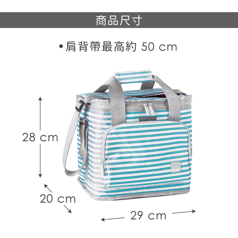 尺寸:長 29 x 寬 20 x 高 28 cm;袋前拉鍊層長 25 x 高 18 cm;提袋高約 4 cm、肩背帶最高約 50 cm
