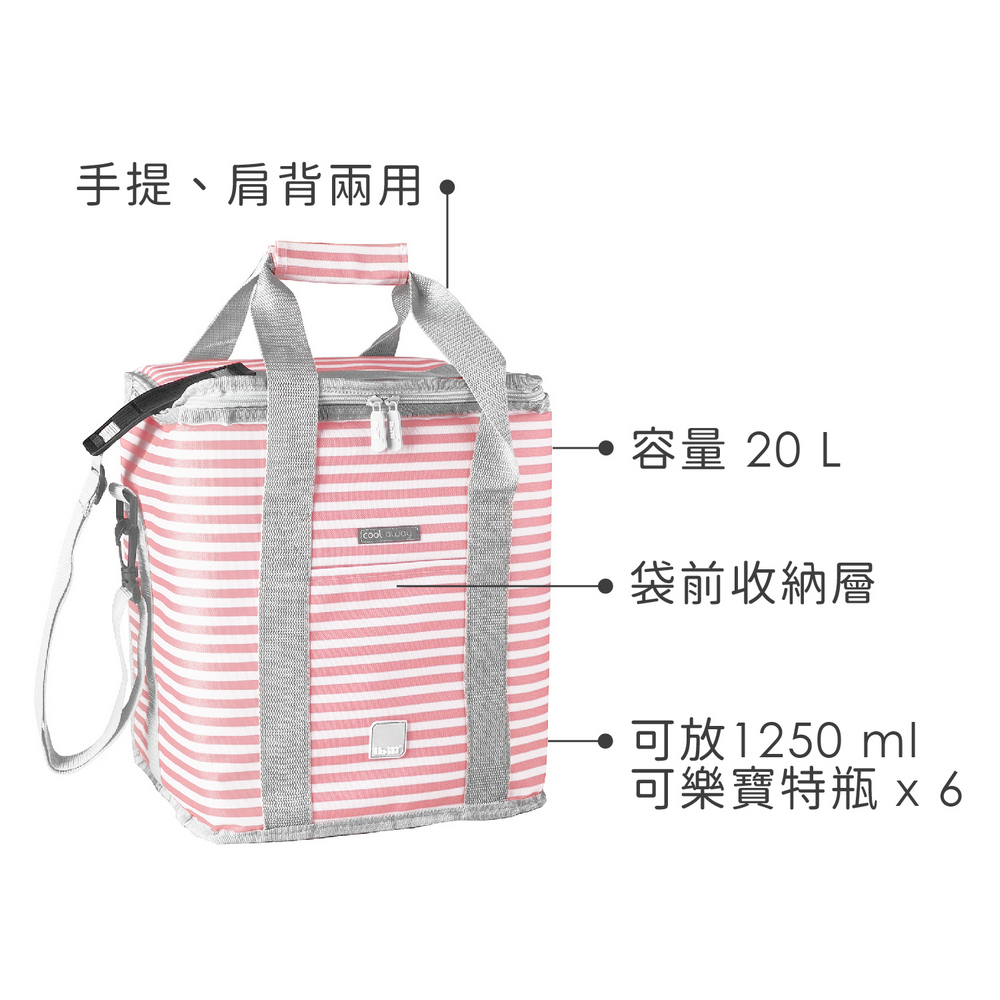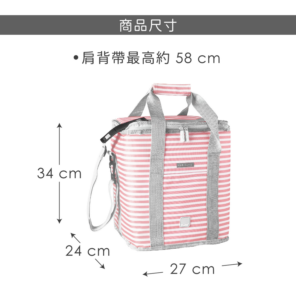 尺寸:長 27 x 寬 24 x 高 34 cm;袋前收納層長 12.5 x 高 18.5 cm;提袋高約 7 cm、肩背帶最高約 58 cm