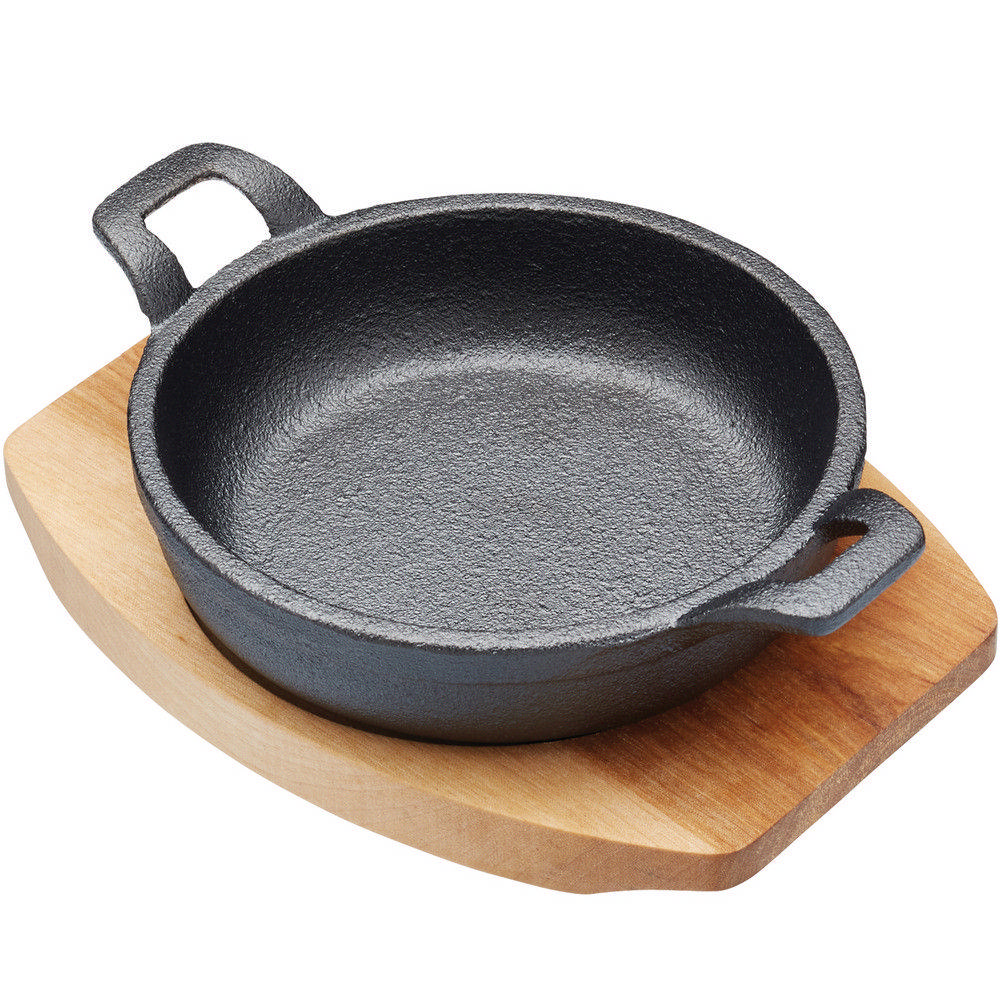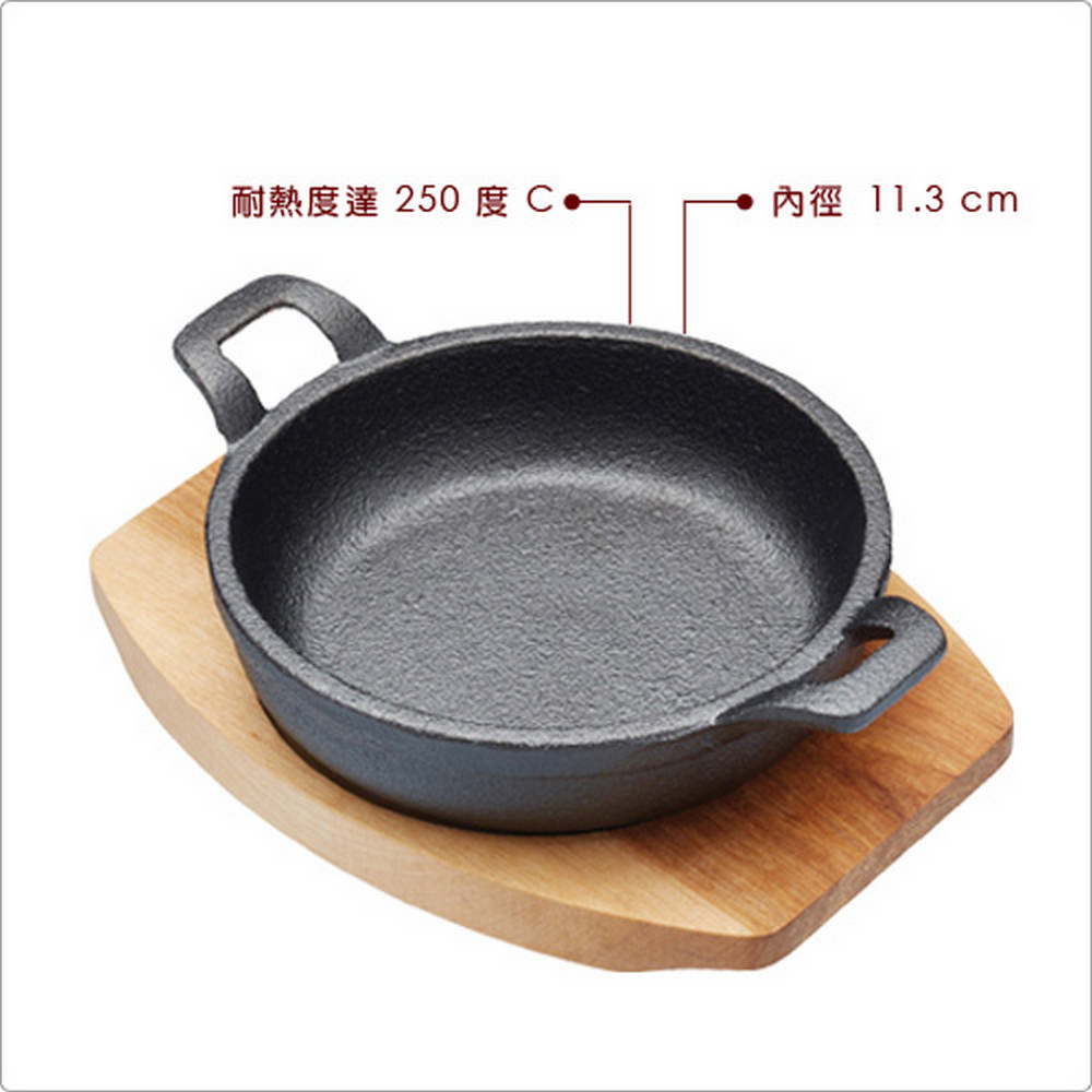 本商品一組含鑄鐵煎烤盤 (盤口內徑 11.3 cm、耐熱度 250 度C)、木盤 (每款木紋可能些微差異) 各 x 1;適用瓦斯爐 (火焰請勿超過盤底與提耳或者請搭配導熱節能板使用)、烤箱、電磁爐、感應爐、電陶爐、電爐 (不適用微波),皆需設定中小火、並搭配不沾鍋專用鏟匙,料理時提耳易熱需配戴隔熱手套使用;煎烤盤屬生鐵鑄鐵盤,不適合烹煮酸性的食物,例如番茄、醋等;煎烤盤高溫時請勿直接清洗或置放流理檯、玻璃檯面以免破損;煎烤盤適用手洗清潔 (每次清潔前需確保冷卻至室溫,請搭配海綿或細緻鬃毛刷)、木盤僅適擦拭清潔,皆請保持乾燥。想要效率烹飪輕鬆料理,您可試試此款煎烤盤。迷你尺寸加速導熱,可縮短烹煮時間,同時擁有導熱均勻長效持溫的特性,適合使用中、小火進行煎、炒或燒烤,且相當適合運用食物本身油脂乾煎,無多餘油脂原味又健康,輕鬆料理小份量的焗烤料理、烘蛋、烙餅、燉菜等餐點以及鐵鍋鬆餅、法式吐司等甜點。還可置於木盤上直接盛盤上桌,既視覺享受也可避免熱氣損傷桌面。另亦可當開胃菜盤使用。開鍋:第一次使用前,請先用溫熱肥皂水搭配海綿或細緻鬃毛刷 (勿用鋼刷) 徹底清潔後,先用小火徹底烘乾。再以植物油均勻塗抹薄薄一層於煎烤盤內層,放置於瓦斯爐爐口,以小火預熱 90 秒後轉中火,持續以中火加熱約 10~20 分鐘使烤盤吸收油份,待達到油份發煙點後即會開始冒煙,便可將火源關閉,靜置煎烤盤待冷卻後用廚房紙巾擦拭多餘的油脂,即完成開鍋;除了瓦斯爐開鍋方式,亦可使用烤箱進行開鍋 (操作說明請詳閱內附說明書)。日常使用保養:每次請先小火再轉中火預熱煎烤盤約 90 秒,即可加強不沾效果;每次清潔時,需待煎烤盤冷卻後再用海綿或細緻鬃毛刷 (勿用鋼刷,並且不建議使用清潔劑,以免破壞長期累積的黝黑發亮的不沾表層),搭配溫熱水清洗後,先用廚房紙巾按壓擦拭表面水份,以中小火徹底烘乾後,再用廚房紙巾沾點植物油均勻薄薄塗滿煎烤盤內層,完成保養再作收納。