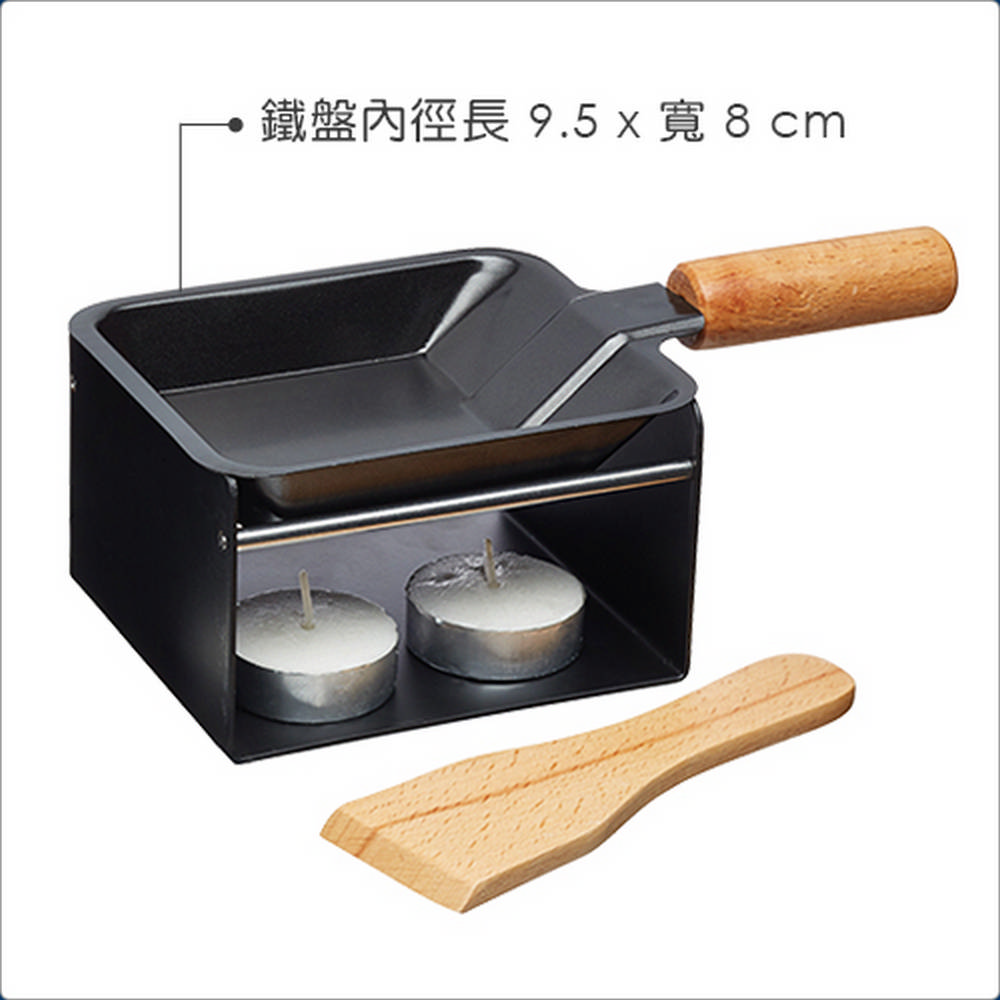 尺寸:組合時含握把長 19 x 寬 9.4 x 高 7.8 cm;鐵盤內徑長 9.5 x 寬 8 x 高 2 cm;木鏟長 13 x 寬 3.8 x 高 0.5 cm