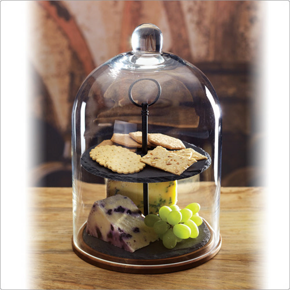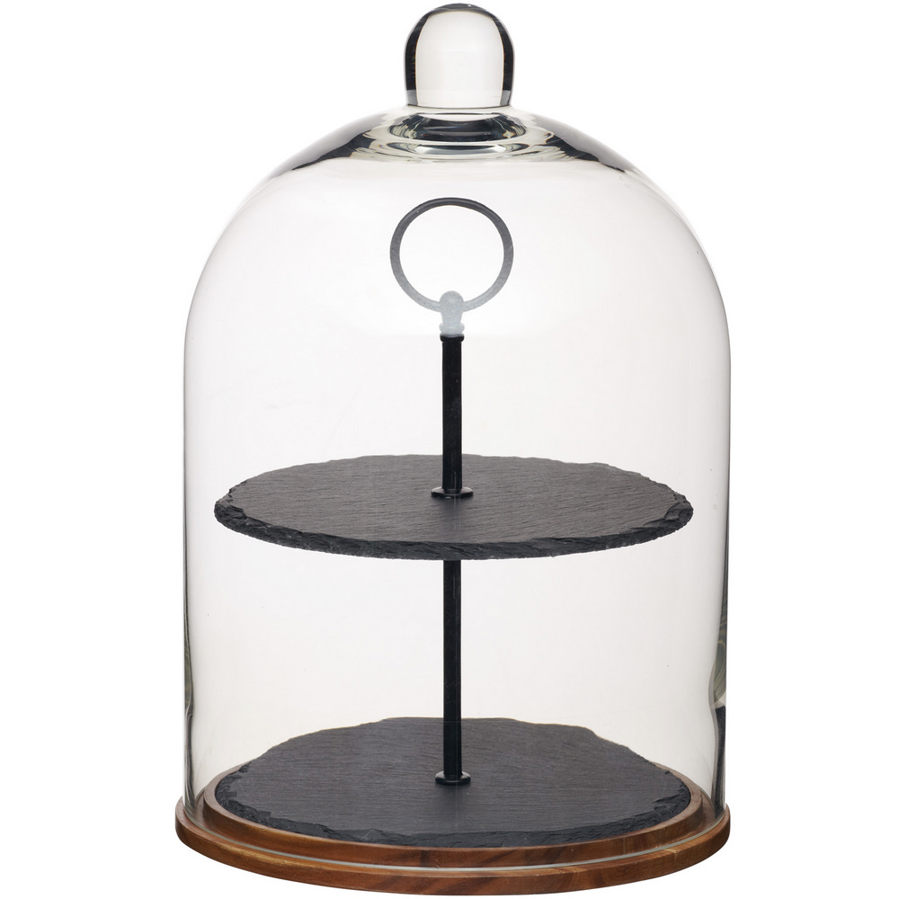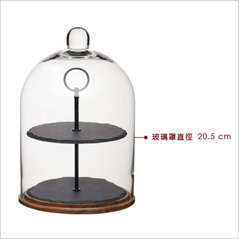 尺寸:點心盤組裝後直徑 18 x 高 22 cm;板岩盤直徑 18 x 高 0.5 cm;木質底盤直徑 21 x 高 1.7 cm;玻璃罩直徑 20.5 x 高 31 cm