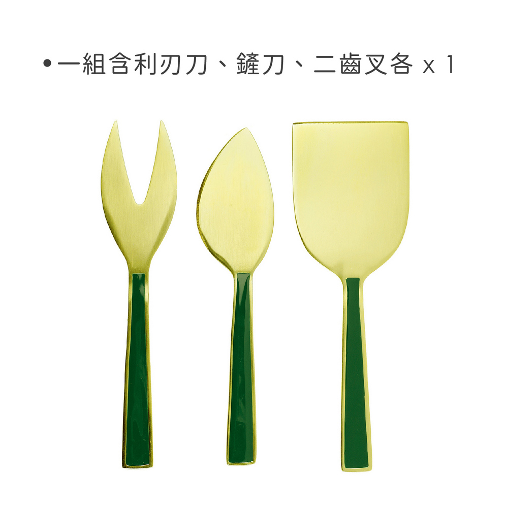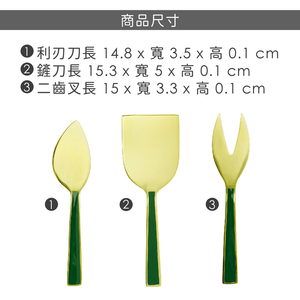 尺寸:利刃刀長 14.8 x 寬 3.5 x 高 0.1 cm、鏟刀長 15.3 x 寬 5 x 高 0.1 cm、二齒叉長 15 x 寬 3.3 x 高 0.1 cm