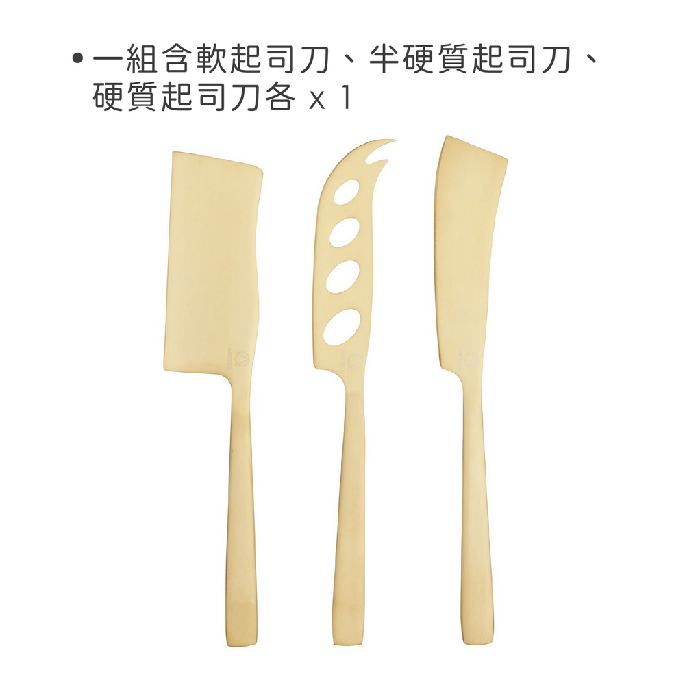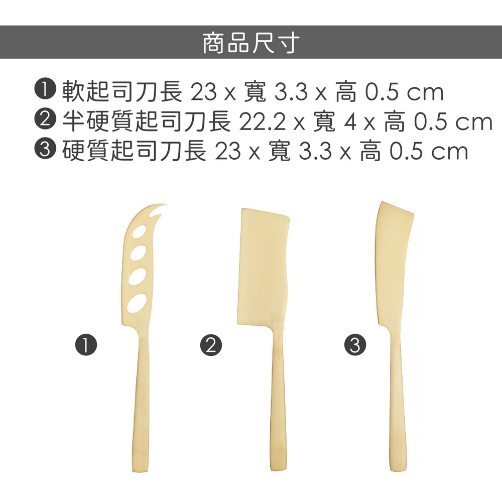 尺寸:軟起司刀長 23 x 寬 3.3 x 高 0.5 cm、半硬質起司刀長 22.2 x 寬 4 x 高 0.5 cm、硬質起司刀長 23 x 寬 3.3 x 高 0.5 cm