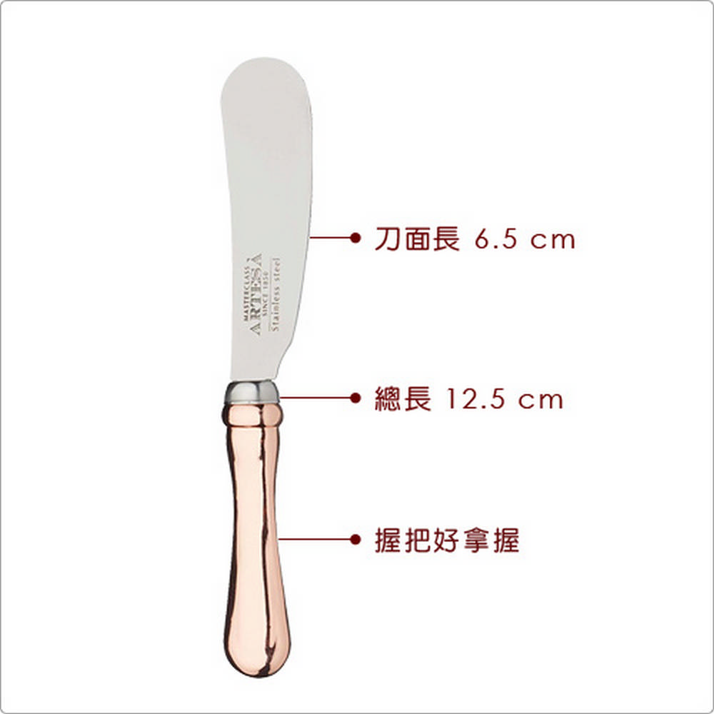 享用麵包小點時,搭配奶油更能增添口感。此款抹刀適合簡易切塊奶油或挖取果醬塗抹於吐司、餅乾上;小巧刀柄容易拿握,搭配玫瑰金色澤富優雅質感。