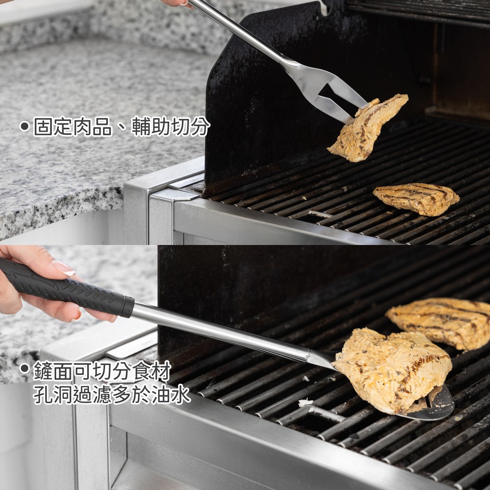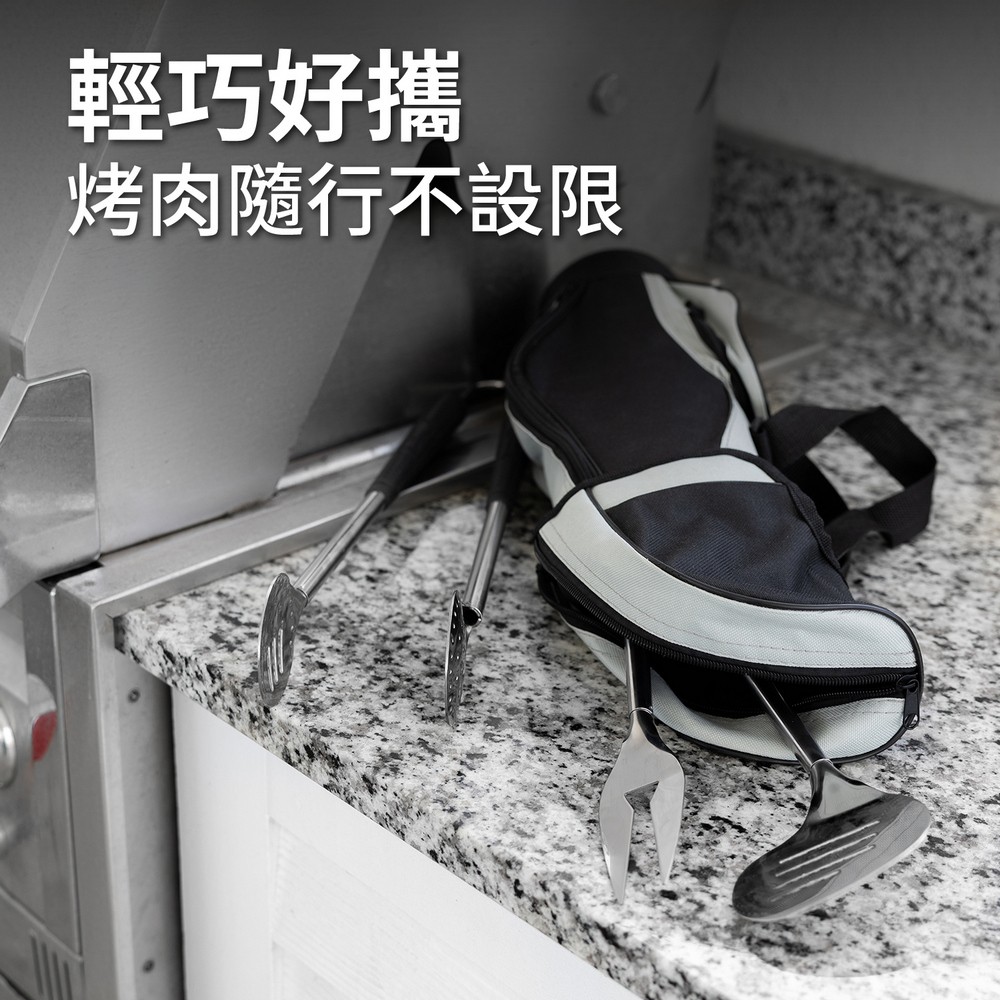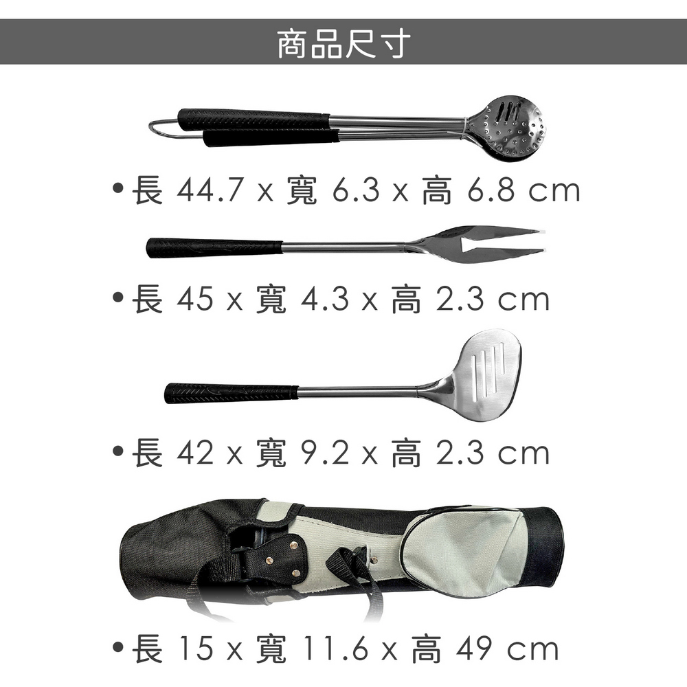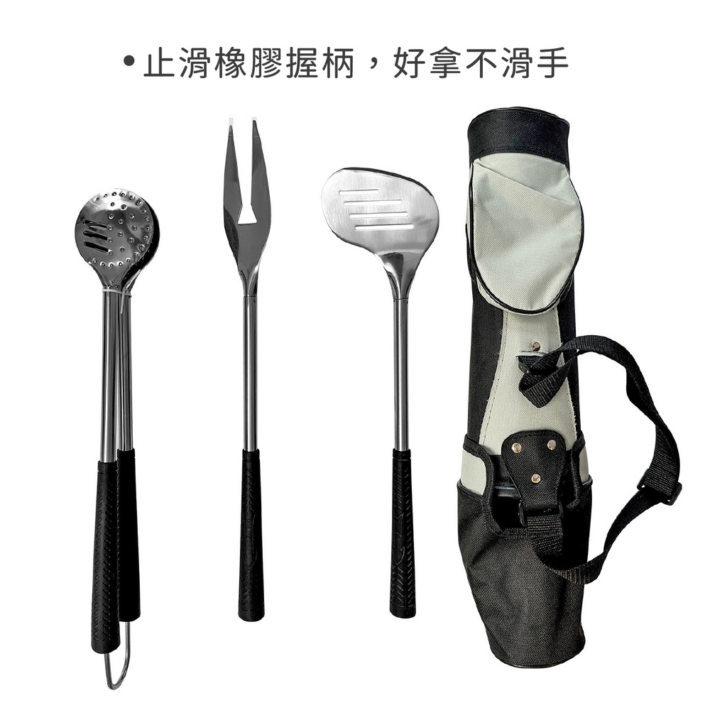 美國 OUTSET - Golf Club附袋不鏽鋼烤肉用具3件 / 燒烤用具組 濾油鏟 烤肉夾 烤肉叉