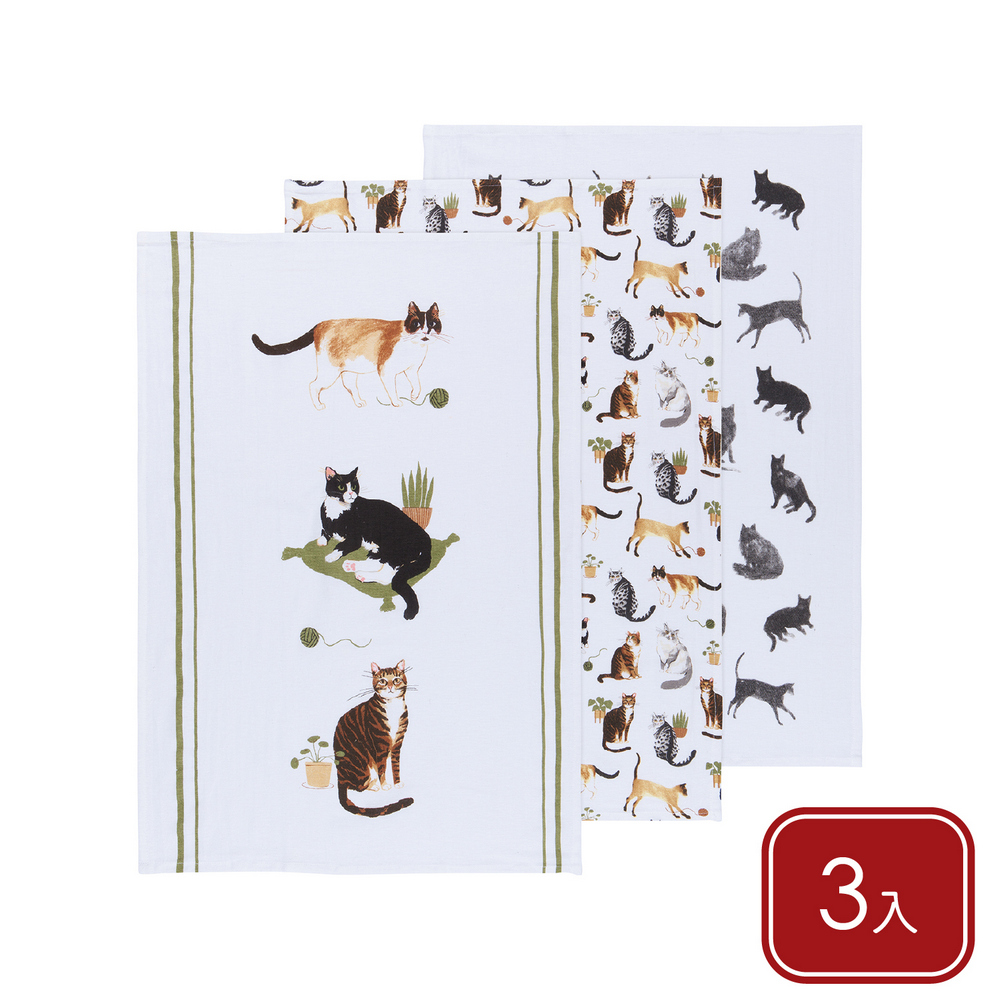 美國 Now Designs By Danica - 純棉擦拭布3入(幸福貓生76x51cm) / 廚房抹布 清潔布 擦拭布 茶巾