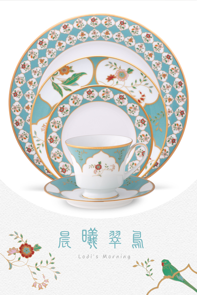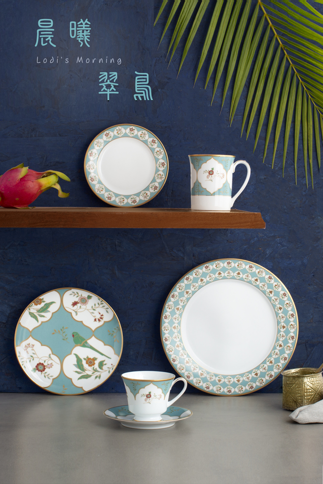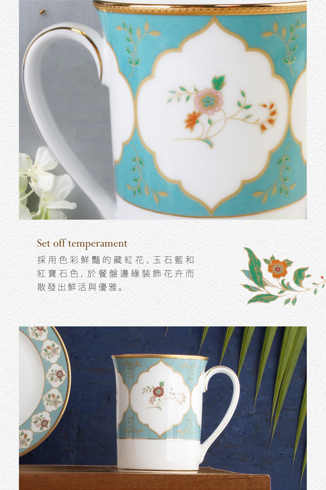 採用色彩鮮豔的藏紅花、玉石藍和紅寶石色,於餐盤邊緣裝飾花卉而散發出鮮活與優雅。