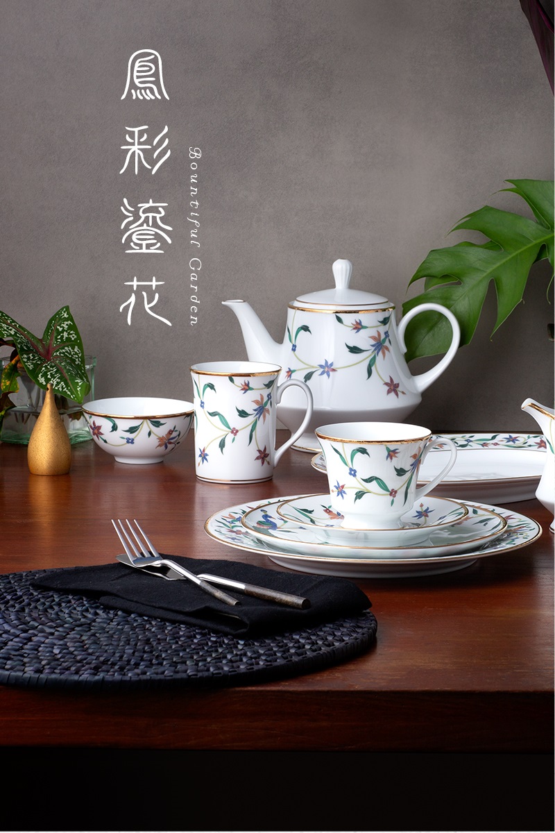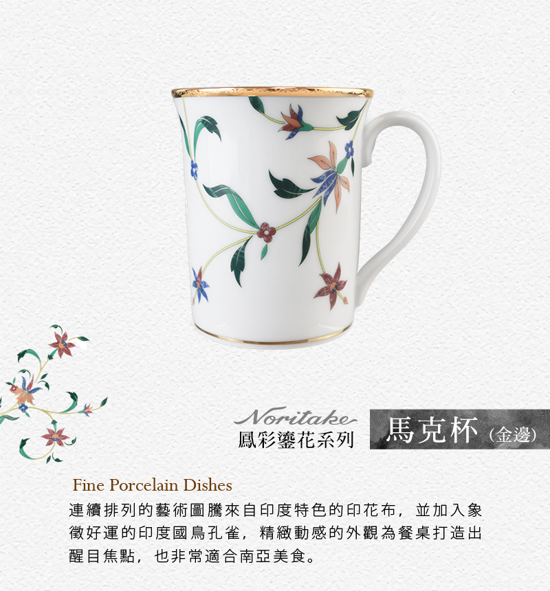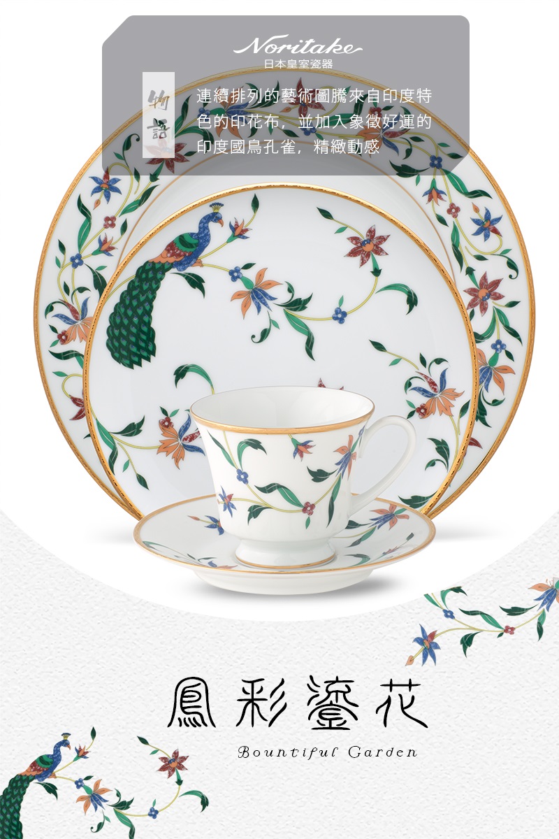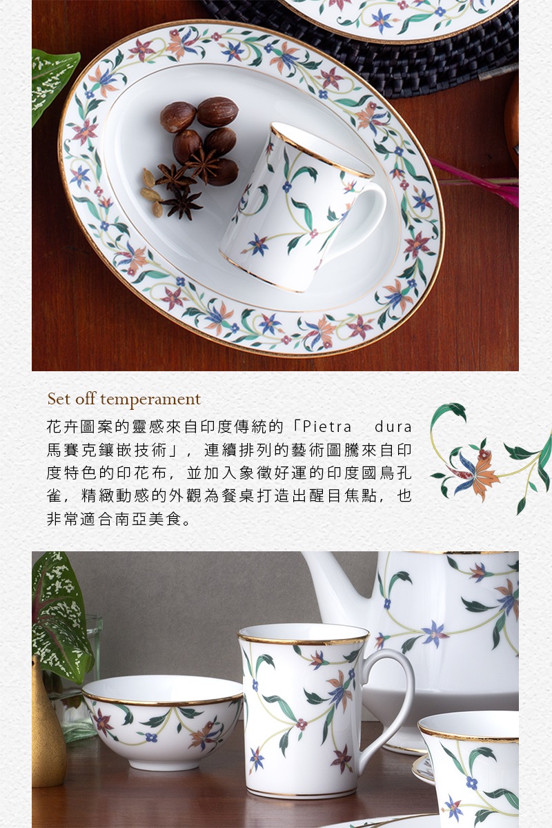 花卉圖案的靈感來自印度傳統的「Pieta dura馬賽克鑲嵌技術」,連續排列的藝術圖騰來自印度特色的印花布,並加入象徵好運的印度國鳥孔雀,精緻動感的外觀為餐桌打造出醒目焦點,也非常適合南亞美食。