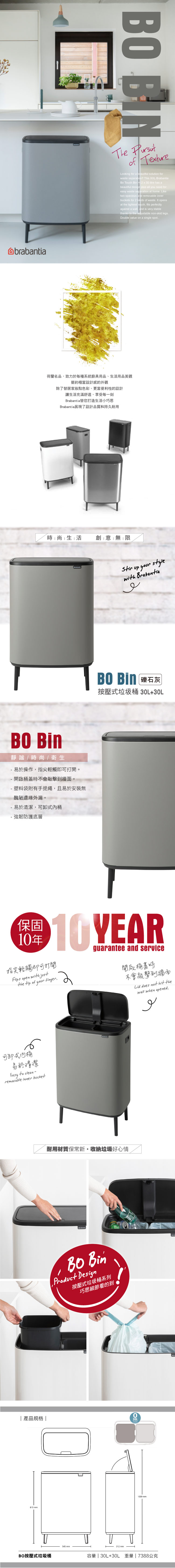 Brabantia BO Hi系列-時尚按壓式垃圾筒30+30L-礫石灰(特殊礦物塗層)