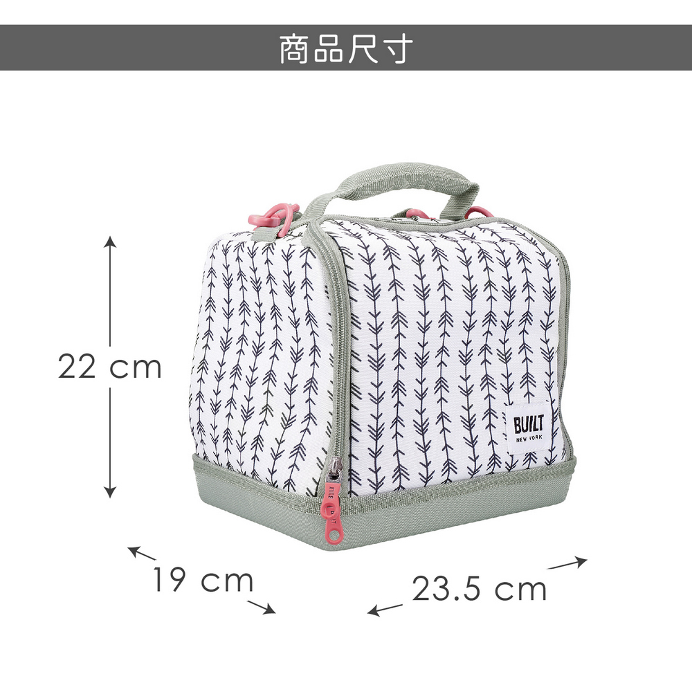 尺寸:長 23.5 x 寬 19 x 高 22 cm;下層高約 10 cm、上層高約 9 cm;拉鍊層長 22 cm、肩背帶最長約 124 cm