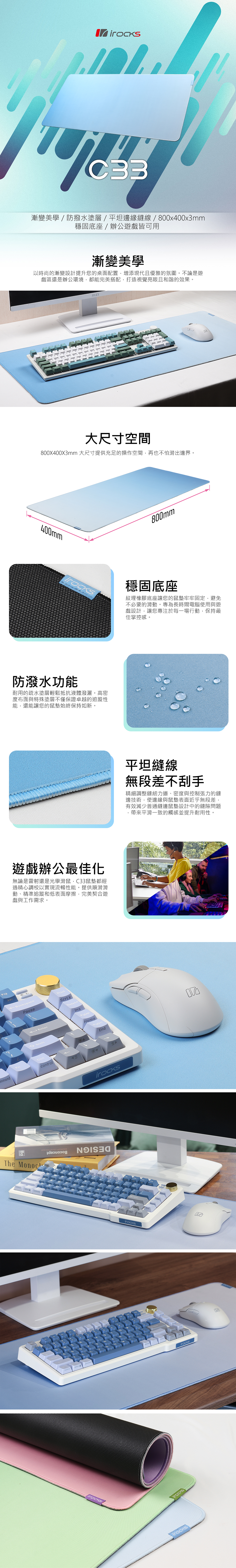 •產品名稱: 滑鼠墊 •產品型號: IRC33 •材質 : 超細纖維布面+PU/天然橡膠 •重量 : 約510 g •尺寸 : 800 (L) x 400 (W) x 3 (H) mm •製造國家: 大陸 •製作年份: 2024 •保 固 期: 6個月