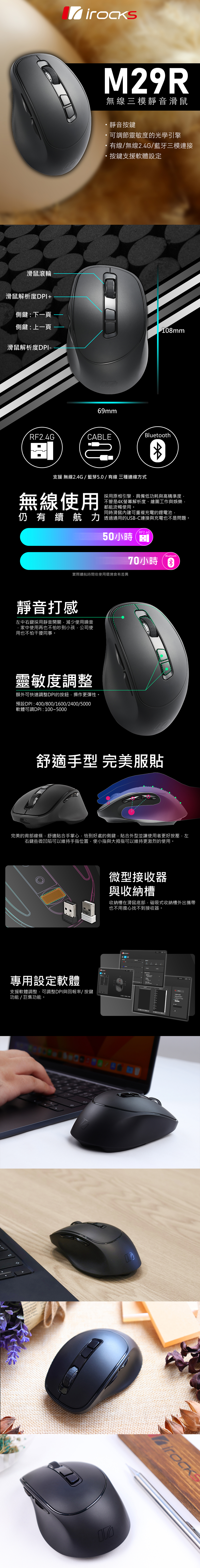 產品名稱: 無線滑鼠 產品型號: IRM29R 介面 : 有線: USB & 無線: 2.4GHz & 藍牙5.1 按鍵數 : 7鍵 ( 左/中/右 靜音開關) 解析度 : 200-5000 dpi ( 可軟體調整 )內定值: 400/800/1600/2400/5000 回報率: 125/250/500/1000 Hz 無線傳輸距離: 10M 充電電壓: DC 5V 充電接口: USB- C 可充式鋰電池容量: 380 mAh 支援應用軟體設定 傳輸線長度: 180 CM 產品尺寸 : 108 mm X 69 mm X 42 mm 產品重量 : 約 84 g 接收器 介面: USB 產品尺寸: 18.6(L) X 14.2(W) X 6.1 (H) mm 製造產地 : 中國大陸 保固期 : 1 年 系統需求 微軟的視窗系統 Windows® 8.1, Windows® 10, Windows® 11. 可用的USB傳輸埠