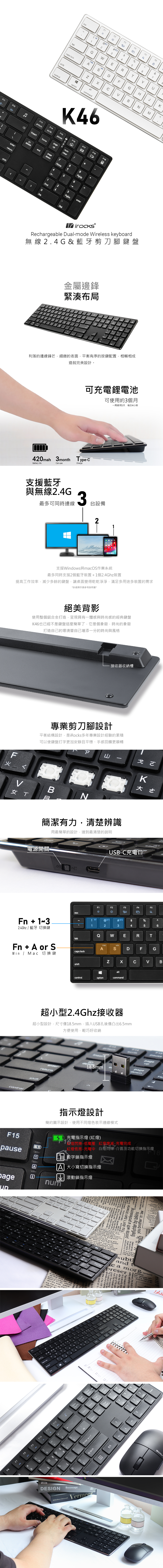 產品型號: IRK46BR 產品名稱: 無線鍵盤 連接介面 : Wireless、2.4GHz & Bluetooth 5.1 ( 藍牙支援二台裝置切換 ) 按鍵數量 : 109 鍵 按鍵型式 : 剪刀腳結構 按鍵壽命 : 800萬次 按鍵行程 : 2.0 ±0.3 mm 按鍵荷重 : 60±10g 電源開關 : On/Off 傳輸距離 : 約10 M 電力續航 : 約3個月(每日4小時 . 一周5天計算) 充電電源 : DC 5V (請勿使用快充充電器充電) 充電接口 : USB-C 充電線 : USB充電線120 CM 可充電鋰電池容量: 420mAh 鍵盤尺寸: 431.8 (L)*118.7 (W)*18 (H) mm 2.4GHz接收器尺寸: 18.7 (L) x 14.2 (W) x 6.1 (H) mm