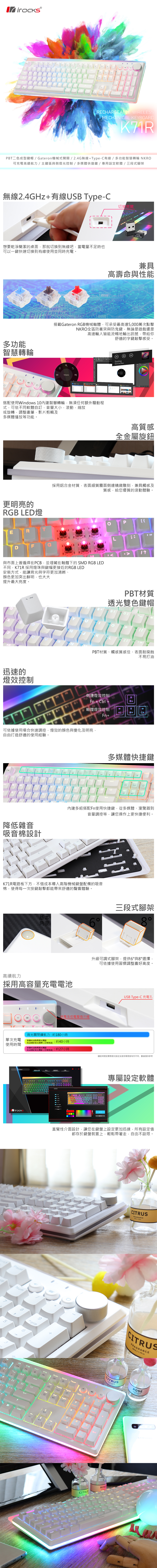 產品名稱: 無線機械鍵盤 產品型號: IRK71R 介面: 有線&無線雙模 有線: USB 無線: 2.4GHz 背光: RGB背光 無線省電模式: 4種模式 按鍵數: 107 鍵 智慧型按壓滾輪: 1組 開關形式: 機械開關 按鍵行程: 4.0±0.5mm 全區防鬼鍵設計 (NKRO) 多媒體鍵: 15 鍵 背光特效鍵: 8 鍵 有線工作電壓/電流: DC5V / 500 mA 無線充電電壓/電流: DC5V / 0.5 ~ 1A 充電接口: USB- C 無線續航時間參考值: 背光關閉約 180 小時 RGB跑馬背光( 按鍵背光開啟/環狀背光開啟/正常亮度 ) 約 27 小時 RGB跑馬背光( 按鍵背光開啟/環狀背光關閉/正常亮度 ) 約 40小時 可充式鋰電池容量: 3750 mAh 產品重量: 約 1.3 公斤 USB 線長 : 約180 公分 產品尺寸: 444 (L) X 155(W) X 42 (H) mm 產品保固: 1年 接收器 介面: USB 產品尺寸: 18.6 (L) X 14.5 (W) X 6.1 (H) mm 【系統需求】 微軟的視窗系統Windows® 7,Windows® 8.1 , Windows® 10. USB傳輸埠