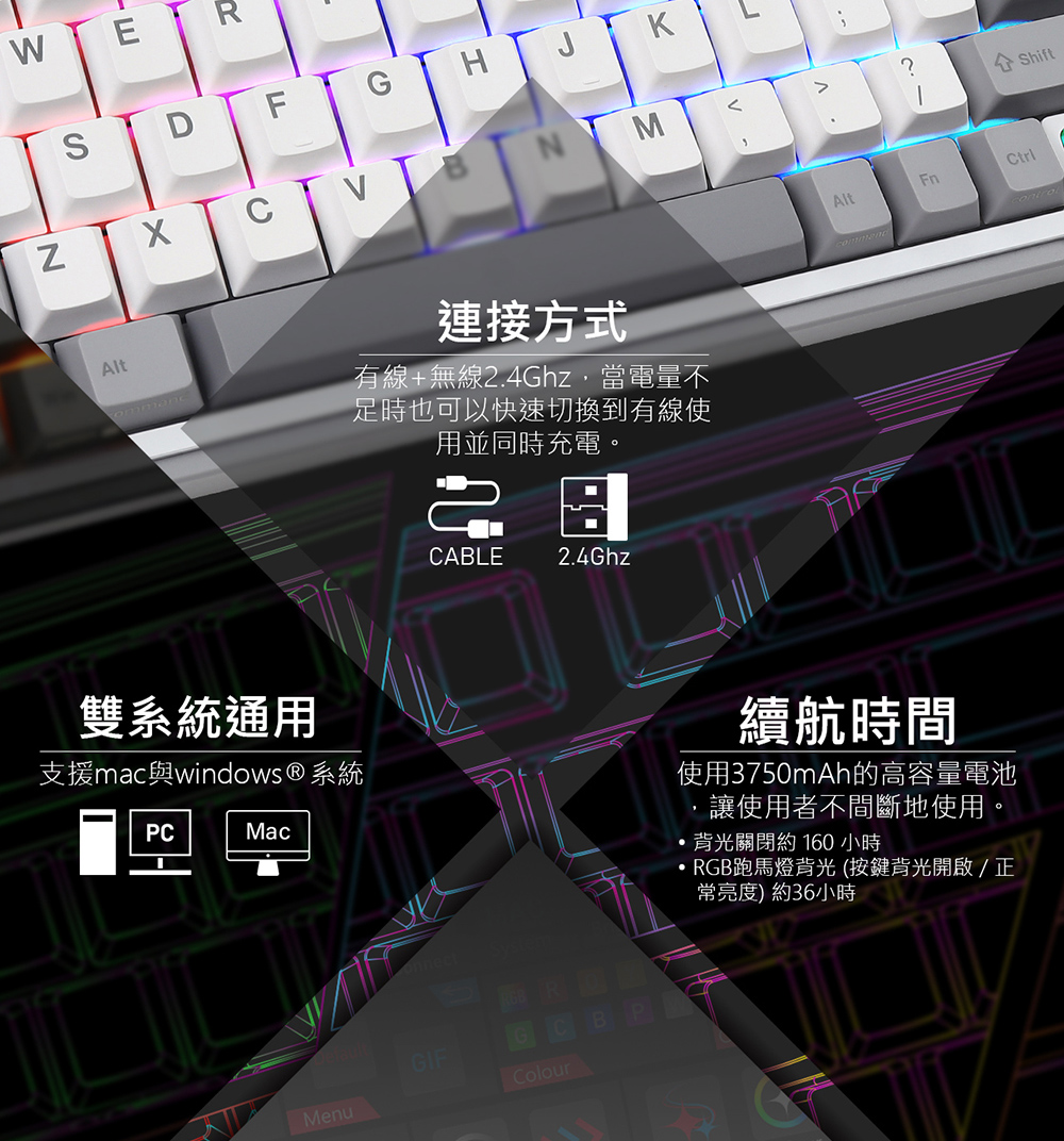產品名稱: irocks K85R 機械式鍵盤-熱插拔軸-RGB背光 產品型號: IRK85R 雙模介面: 有線: USB & 無線: 2.4GHz 按鍵數: 98 鍵 開關形式: 可插拔預潤機械開關 按鍵行程: 3.4±0.5mm 全區防鬼鍵設計 (NKRO) 多媒體鍵: 12 鍵 背光特效鍵: 4 鍵 電壓: DC 5V 充電接口: USB- C 可充式鋰電池容量: 3750 mAh USB 線長 : 約180 公分 產品重量: 約 1030 公克 產品尺寸: 407 (L) X 143(W) X 44(H) mm 接收器: 介面: USB 產品尺寸: 18.6(L) X 14.5(W) X 6.1 (H) mm 其他 製造產地 : 中國大陸 保 固 期 : 1年