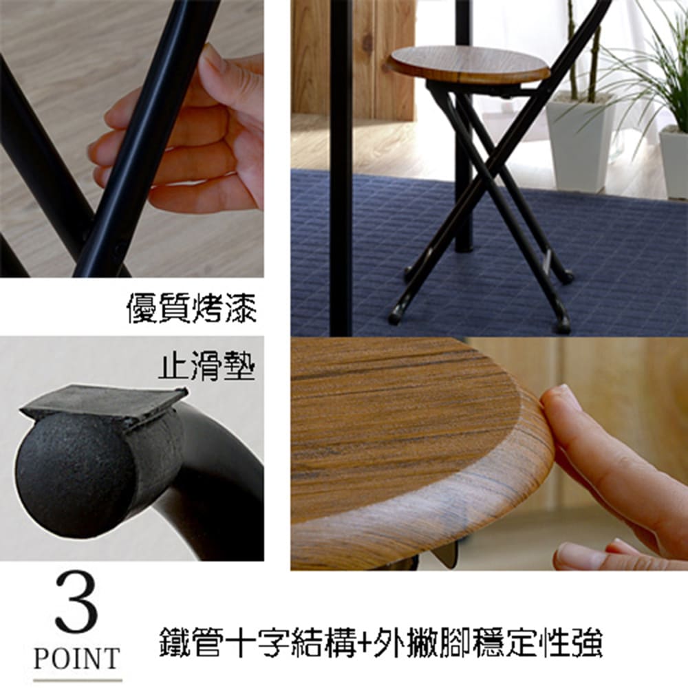 《C&B》古木調復古風格靠背折合椅,主體結構採用結構穩固的鐵管製成,並在四支腳座底端各使用一個防滑橡膠,整體使用起來穩定不搖晃,加上質量都是外銷日本的超高要求,與一般市面的類似椅有很大的差別! 此外,椅腳的防滑套可避免滑動以外,更可保護地面免於刮傷;而座面下方設計有安全扣環,將椅子打開使用後卡榫即自動扣上,讓您無論使用時或折疊時都因為有卡榫而不會發生危險,是讓人信任的安心家具!