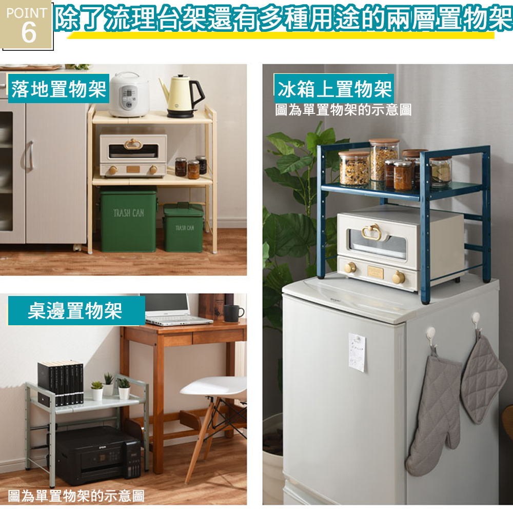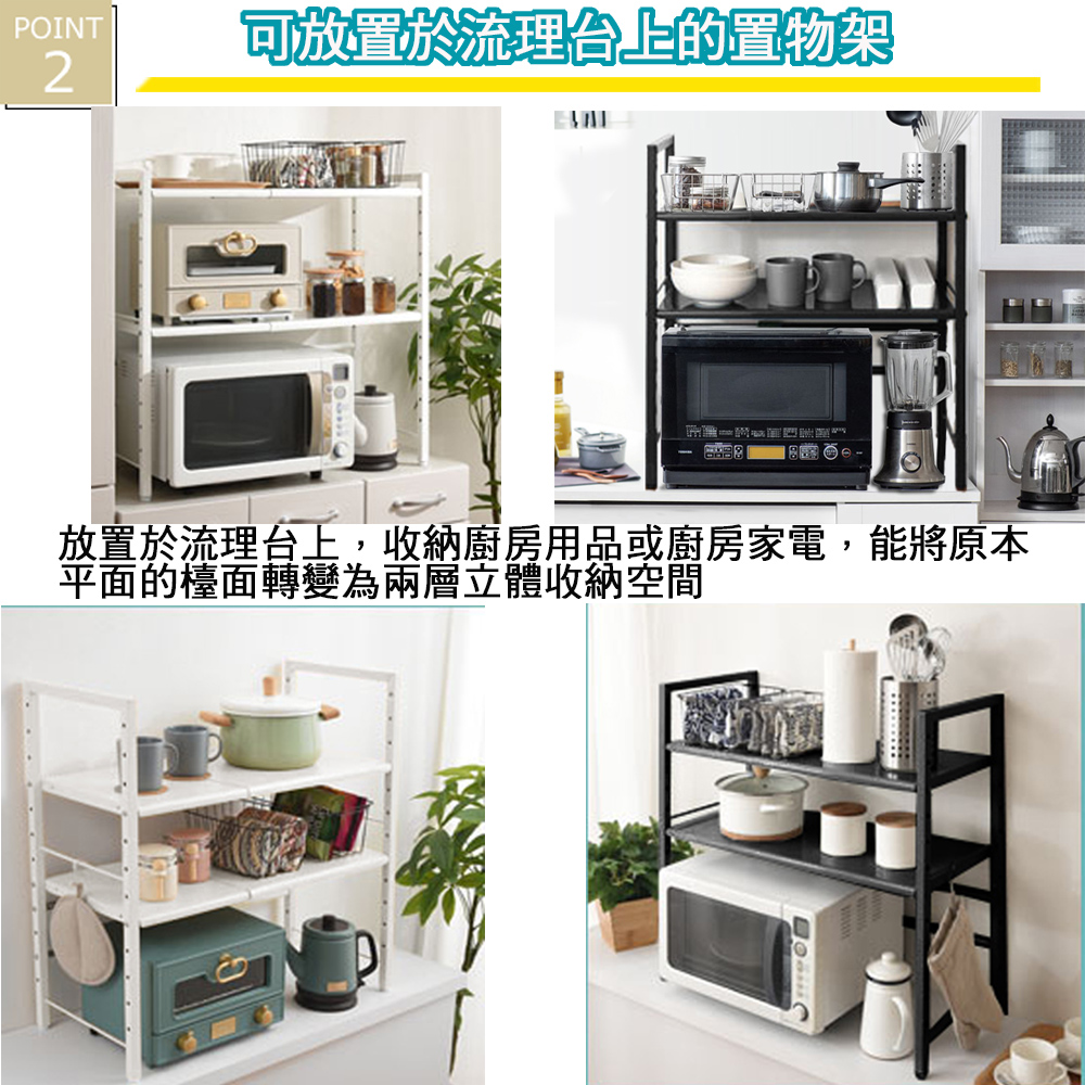 水波爐、氣炸桌、生機調理機、麵包機......一直推陳出新的廚房家電用品看起來都很好用,想入手卻怕無處收納嗎? 藍芽設配、3C用品圍繞在您的桌面,但總覺得書桌太小空間有限?那麼您一定需要這個《C&B》元森桌上流理台上伸縮兩層置物架,它既不會佔去您太多的空間,又能讓您的流理檯面或桌面多了延伸空間,讓平面頓時變成立體的三層空間,所有的東西,依使用率、體積,分別放置,一目了然、取用方便,節省空間,再也不怕空間不夠或找不到東西的窘境了!