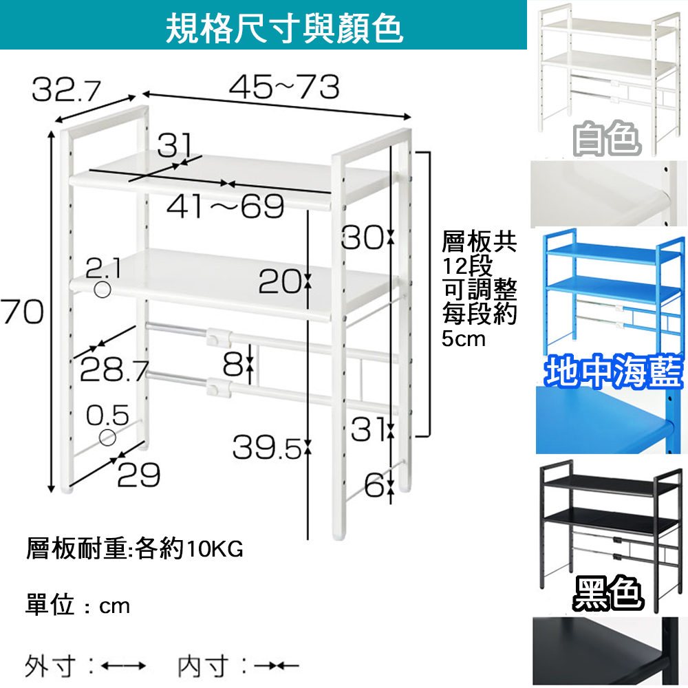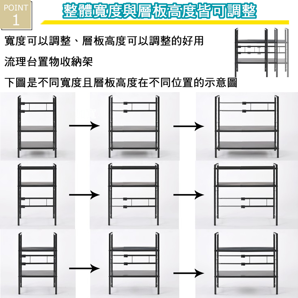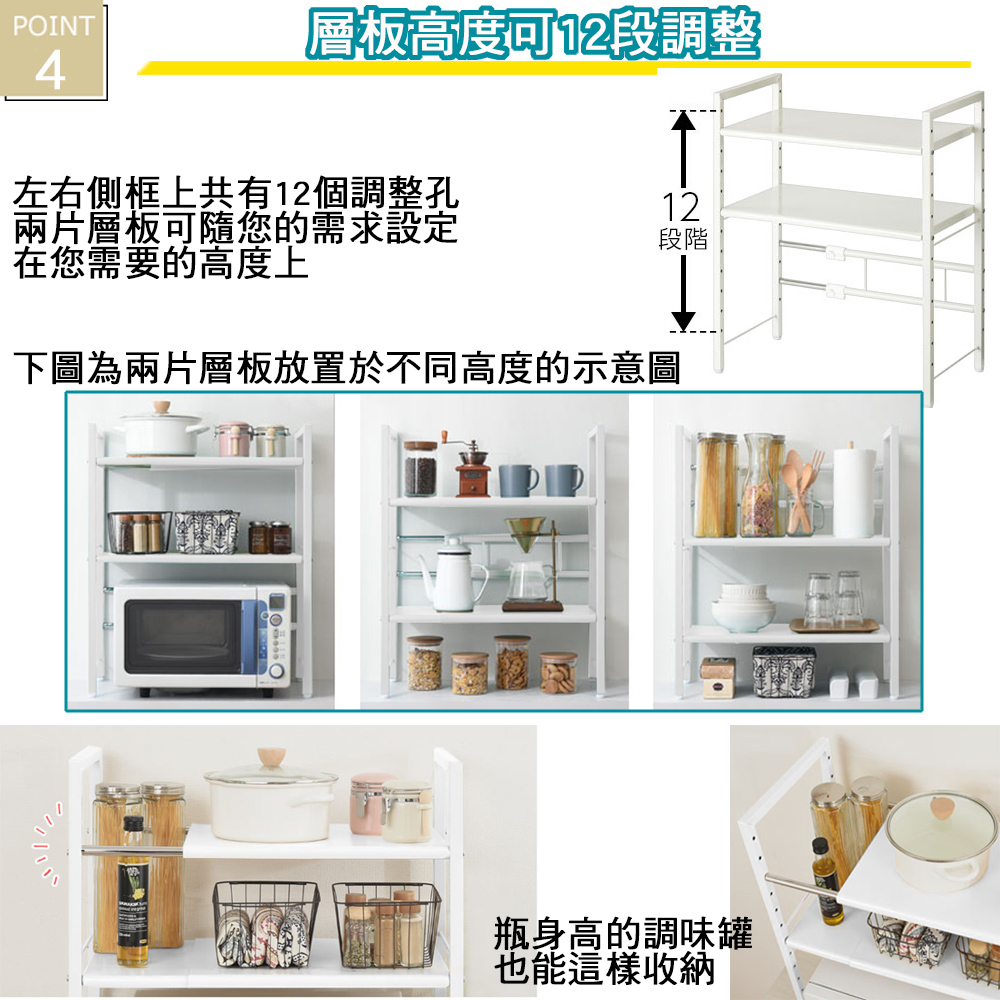 《C&B》元森桌上流理台上伸縮兩層置物架,是一組具有兩個層板的伸縮置物收納架,總寬度可從45公分~73公分之間伸縮、可依您的需要、桌面或檯面的大小來調整使用,層板的高度則有12段的高度可以選擇,可依您放置的物品大小來調整層板高度,宛如量身訂做一樣適合您的各種使用需求。