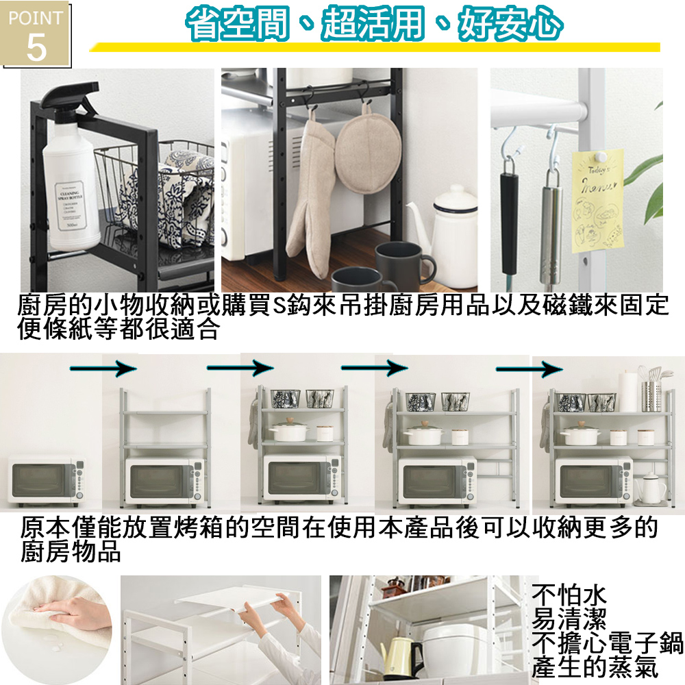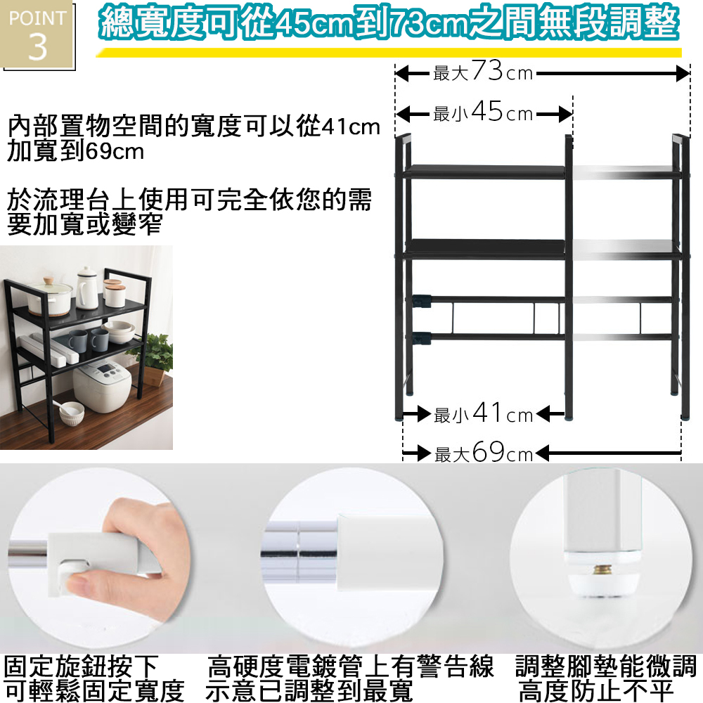台灣生產外銷日本好品質,結構穩固耐用,粉體塗裝耐刮耐鏽又防潑水,當調整寬度時鐵管上壓有警告線避免您調整到過寬而垮下,底部調整腳墊設計因可微調高度也能避免放置處的檯面或地面不平,加上輕鬆按壓即可固定住的調整旋鈕,調整寬度不費力,日式貼心與安心家具的設計發揮到極致。