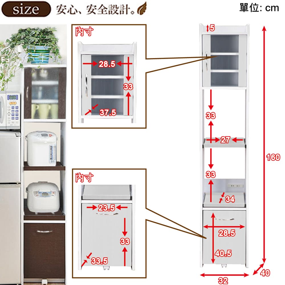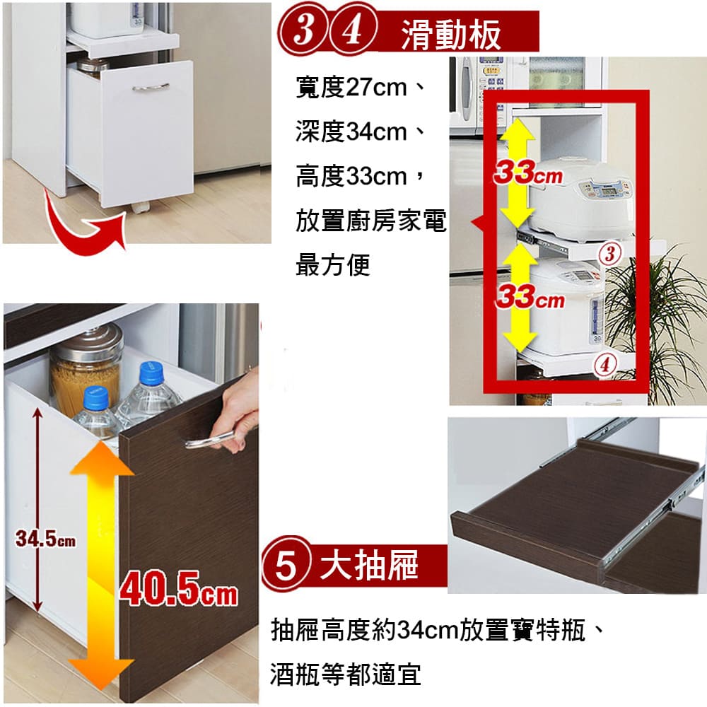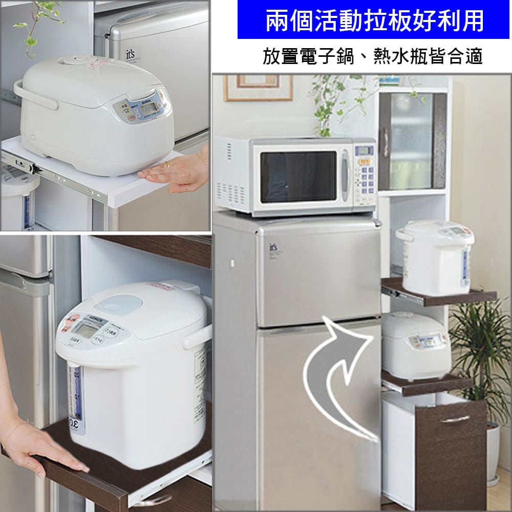 《台所》加高型廚房隙縫電器櫃,共具有兩個推拉式活動平台置物板,方便您放置電子鍋、熱水瓶或小烤箱等廚房家電。活動置物板是採用具煞車功能且堅固耐用的鋼珠滑軌,能夠承受家電的重量,也不會像滾輪滑軌一樣會有掉落下來的危險。此外,為了方便您使用電器,我們也在商品的後方設計了符合日本安規的1500W延長線,共具兩個安全插座,讓您在使用電器的時候不用麻煩的牽就牆壁上的插座位置,不僅是貼心設計,連使用安全都幫您注意到了!