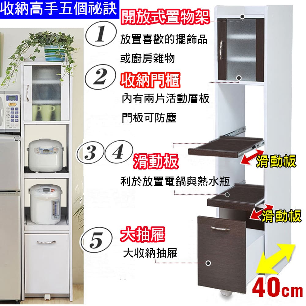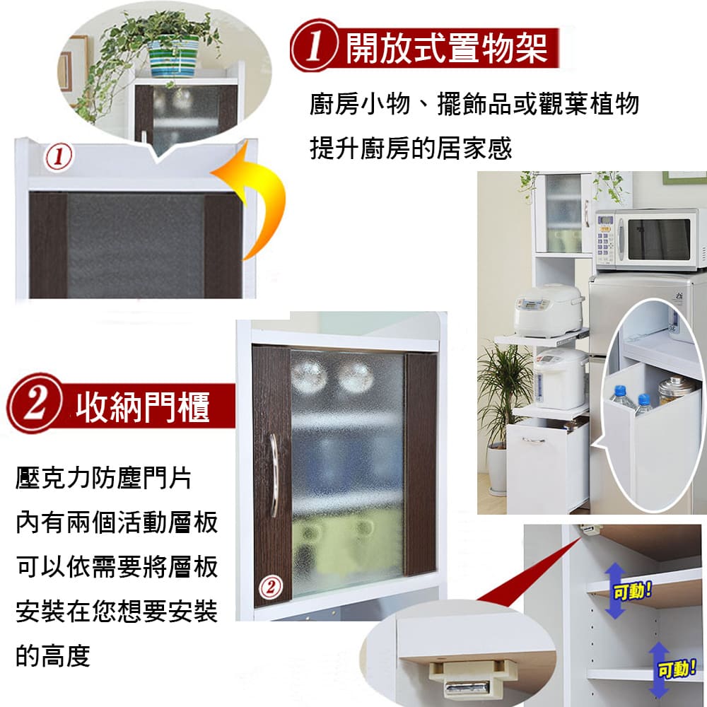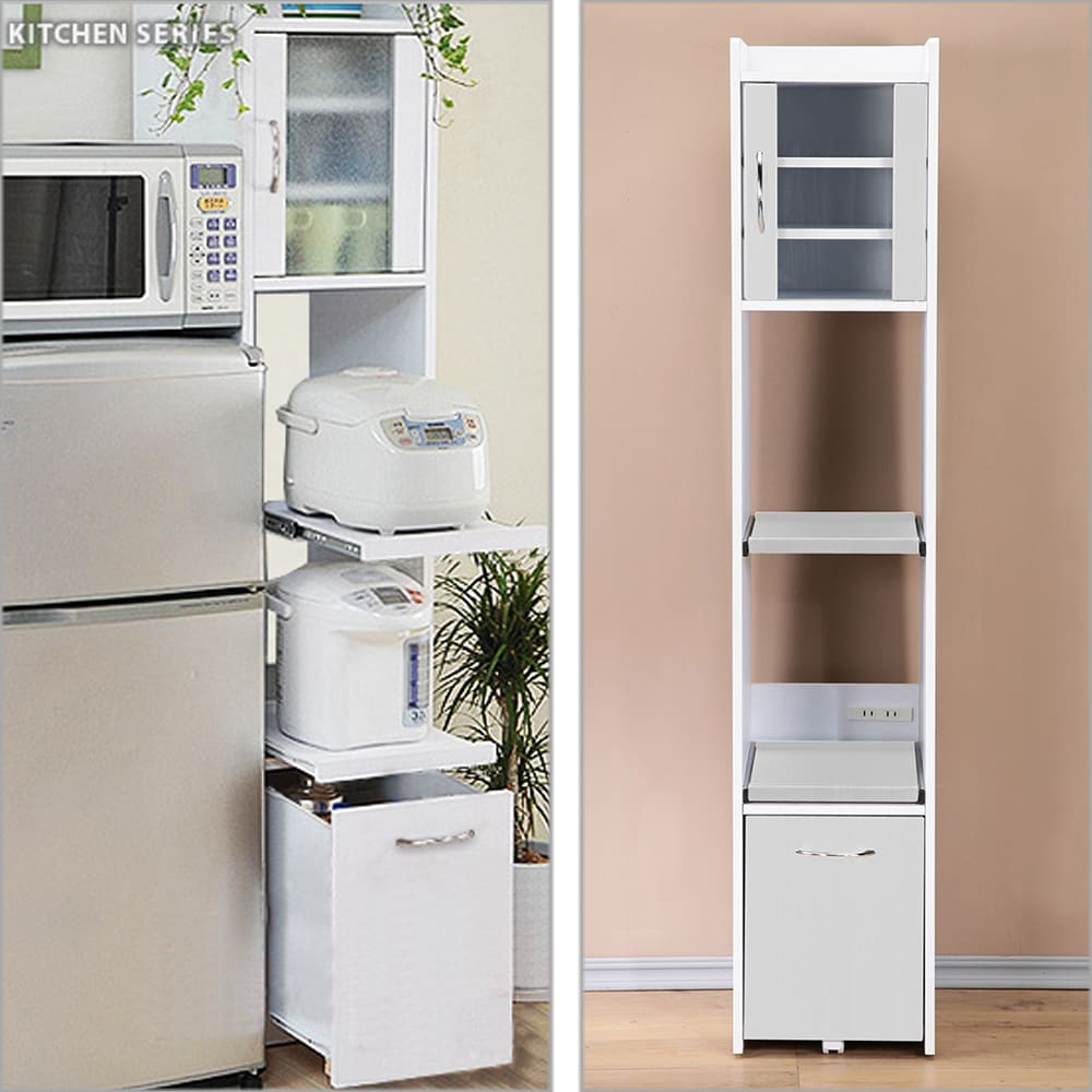《台所》加高型廚房隙縫電器櫃,在最上方有一個收納門櫃,半透明式設計讓內部無論收納什麼物品從外側看過去在視覺上也不覺得凌亂,內部更有兩塊活動層板,可以隨您的需要調整層板高度,十分實用!