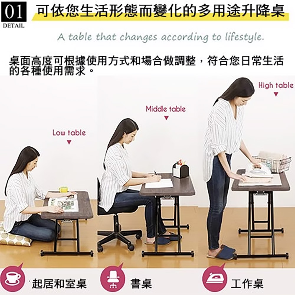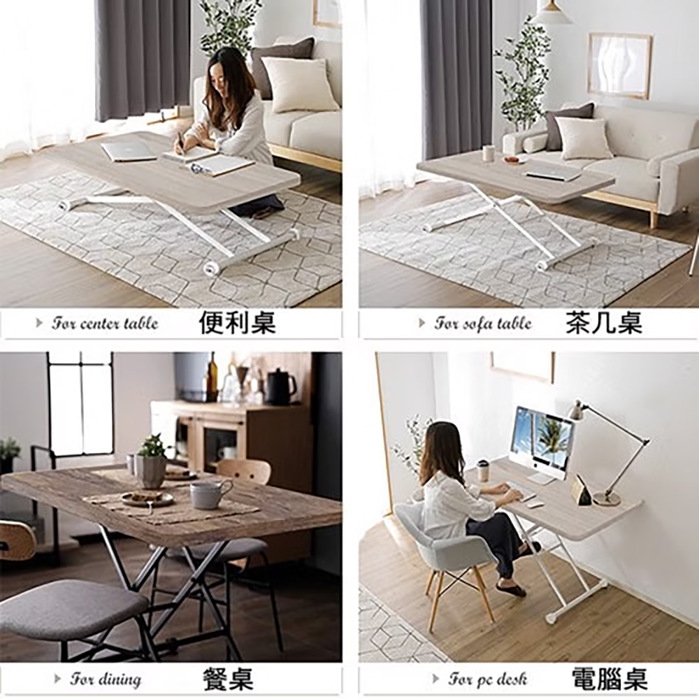 可依您的生活形態而改變使用狀態的《C&B》大崎氣壓式萬用無段升降桌,採用台灣生產的安全升降式氣壓棒,只要one touch一個動作,將位於桌緣的拉把往上扳並施以足夠重力於桌面,即可讓桌面的高度可以從10cm到84cm之間在任意的高度沒有階段限制的升降,不需要工具也不必拆卸螺絲,完全符合您在任何高度的使用需求,客廳茶几桌、和室桌、起居桌、餐桌、工作桌、書桌、站立桌都很適合。