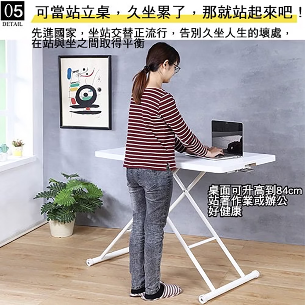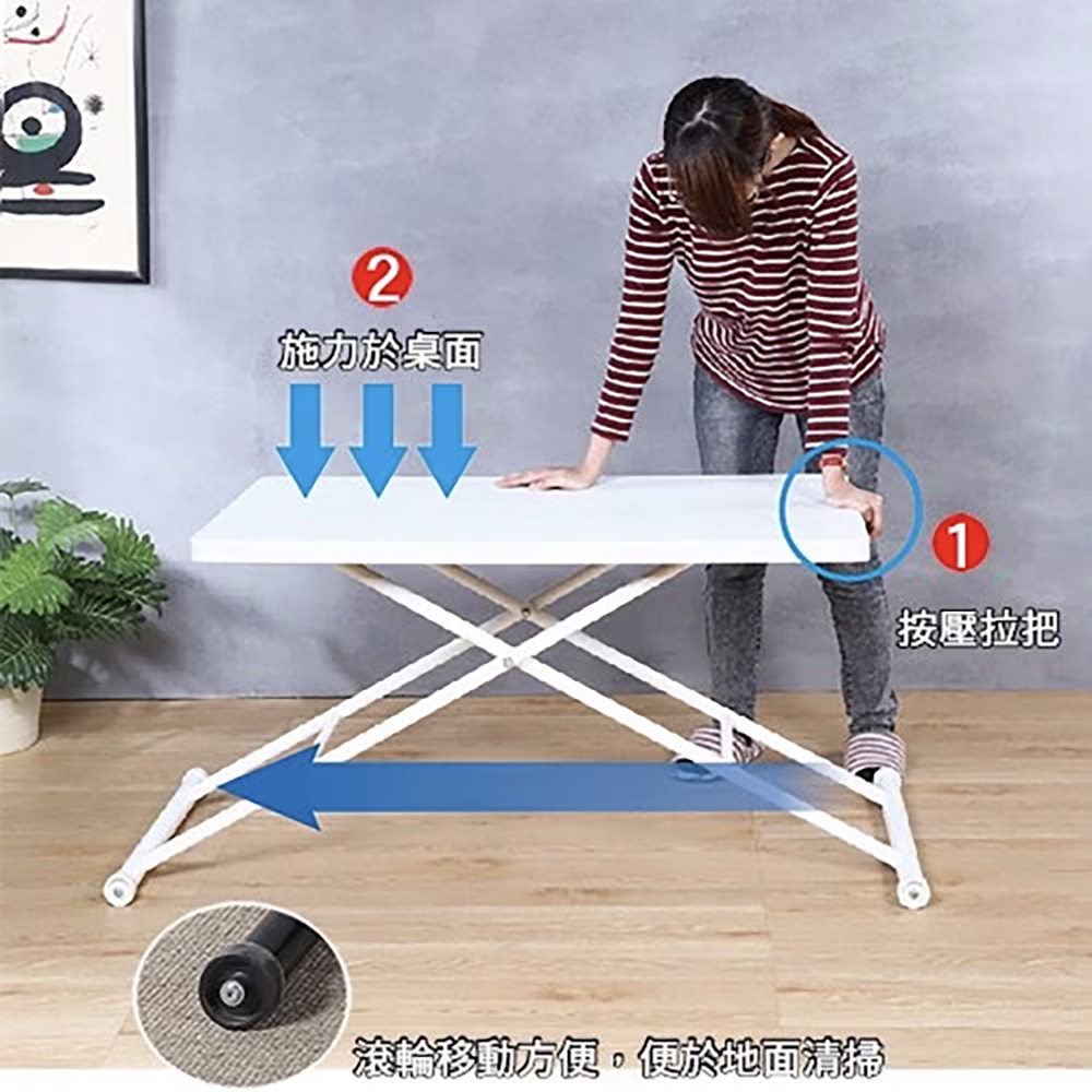 整體支架則採用堅固的鐵管,外表粉體烤漆處理,交叉式的結構穩固耐用耐重佳,氣壓棒為最新型改良式的液態氣壓能緩昇緩降更加安定,腳部有滑輪的貼心設計,無論調整高度或要移動商品時都能輕輕鬆鬆。當桌面調整到最低時,高度只有10cm,便於您不使用時將商品收納到床下或牆角等隙縫處。