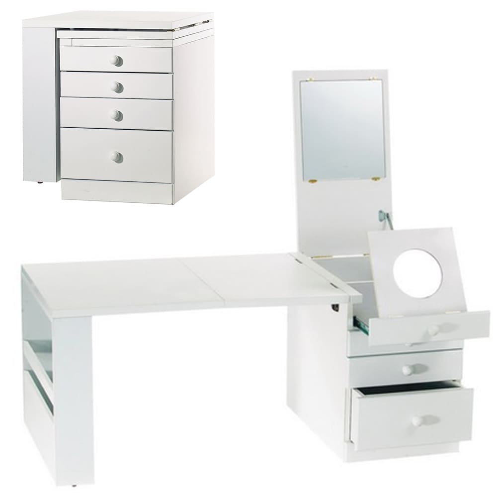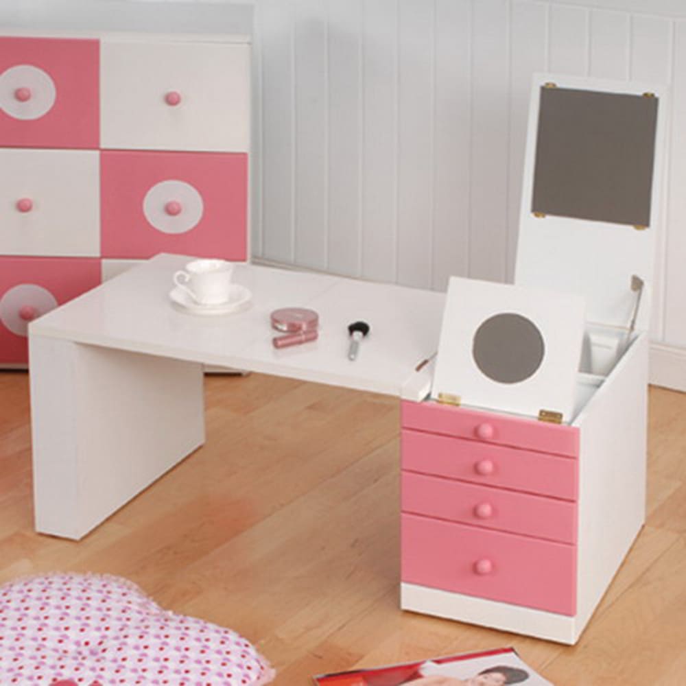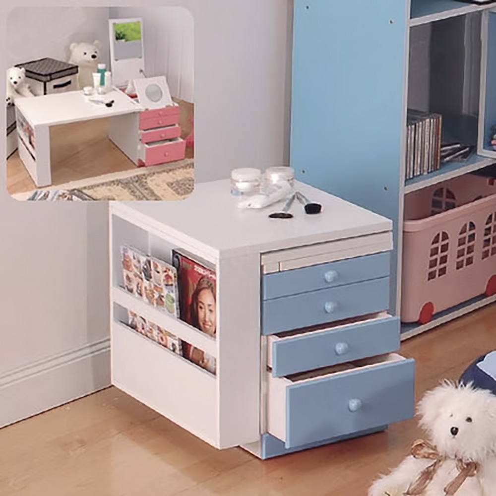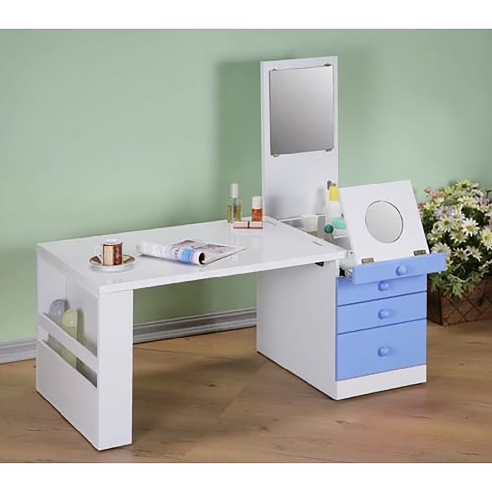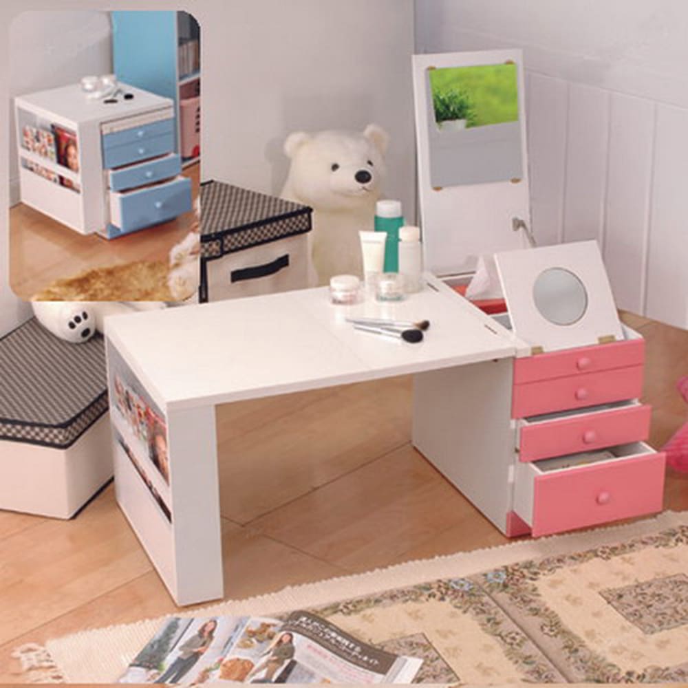 特殊的三折桌面,展開使用時,可當成和室電腦書桌,特別的是最右邊的桌面可以向上掀起,掀起後,有一個化妝用的《大面方鏡》,內部有分格設計,可以放置不同功能的瓶瓶罐罐,下方還有一大一小的兩個抽屜,方便您收納小物。此外,左側設計有雜誌架,要找的參考書籍、資料,隨手即可取得,體貼的是高長型的化妝品罐子,也可以收納在這邊喔!不管閱讀、打電腦、化妝、只需一張桌子就可以完成。