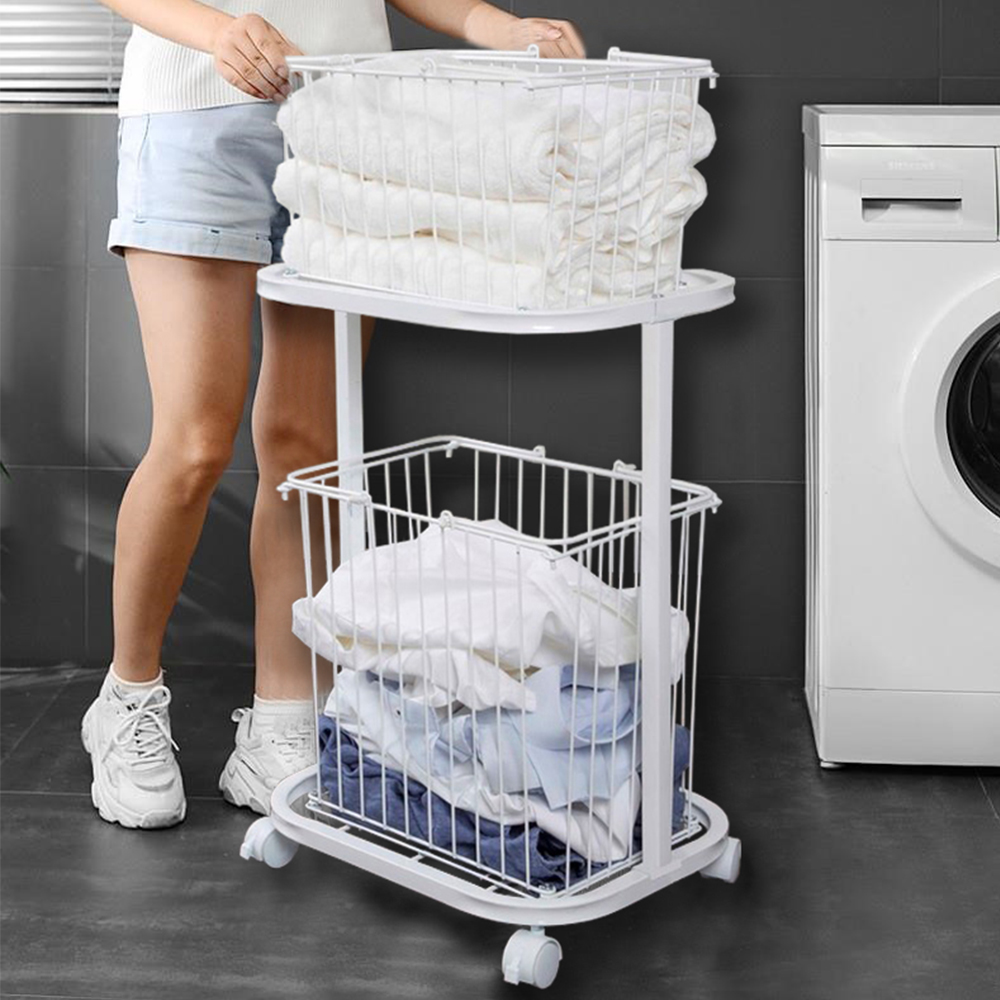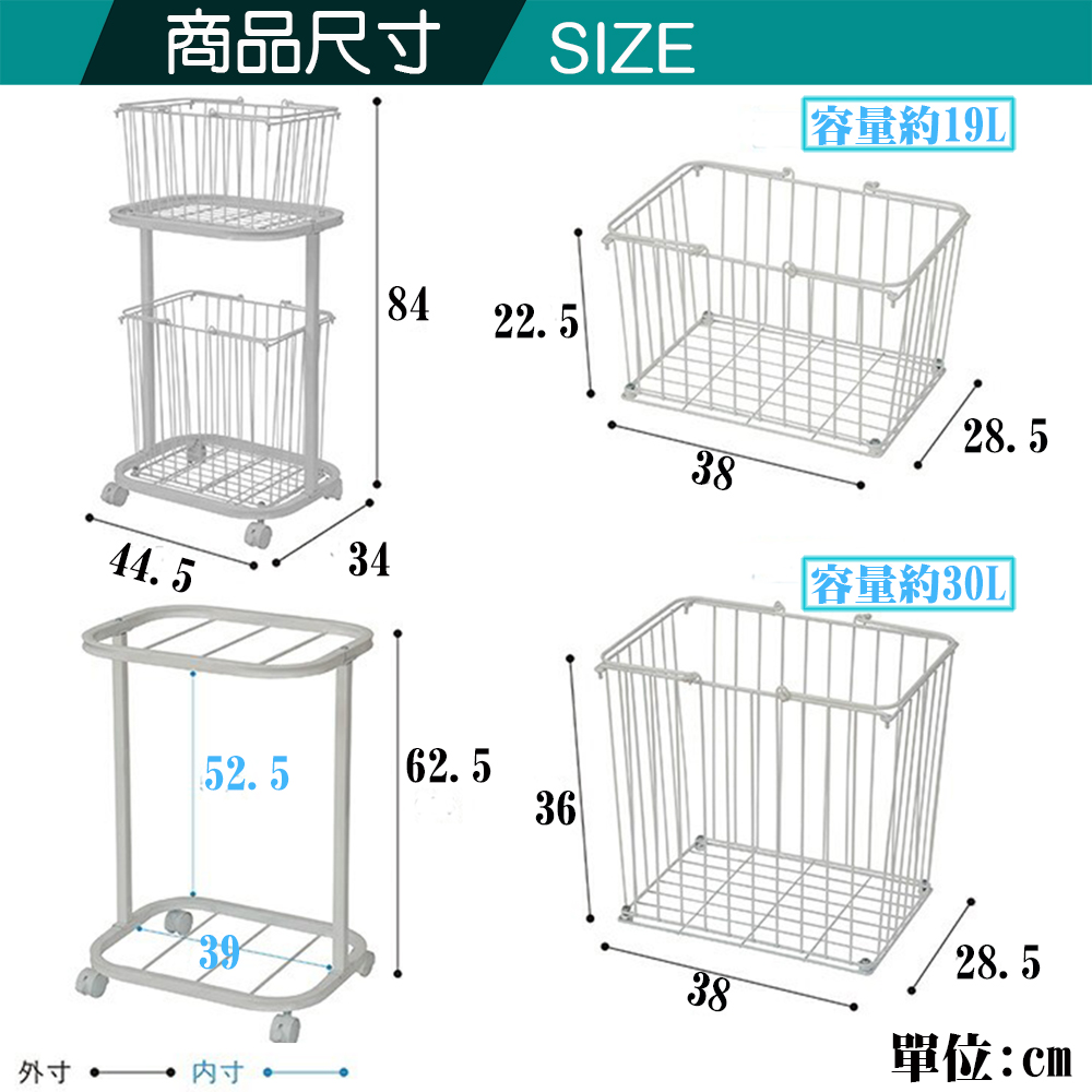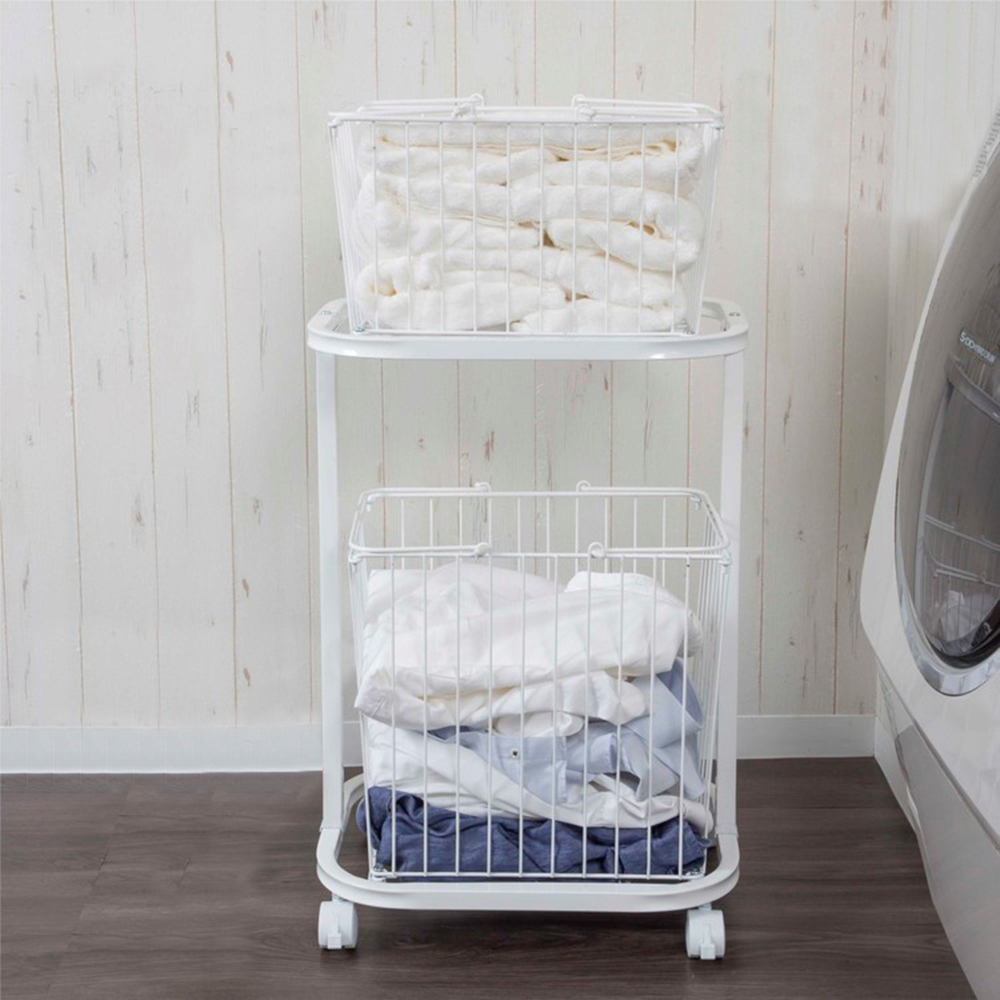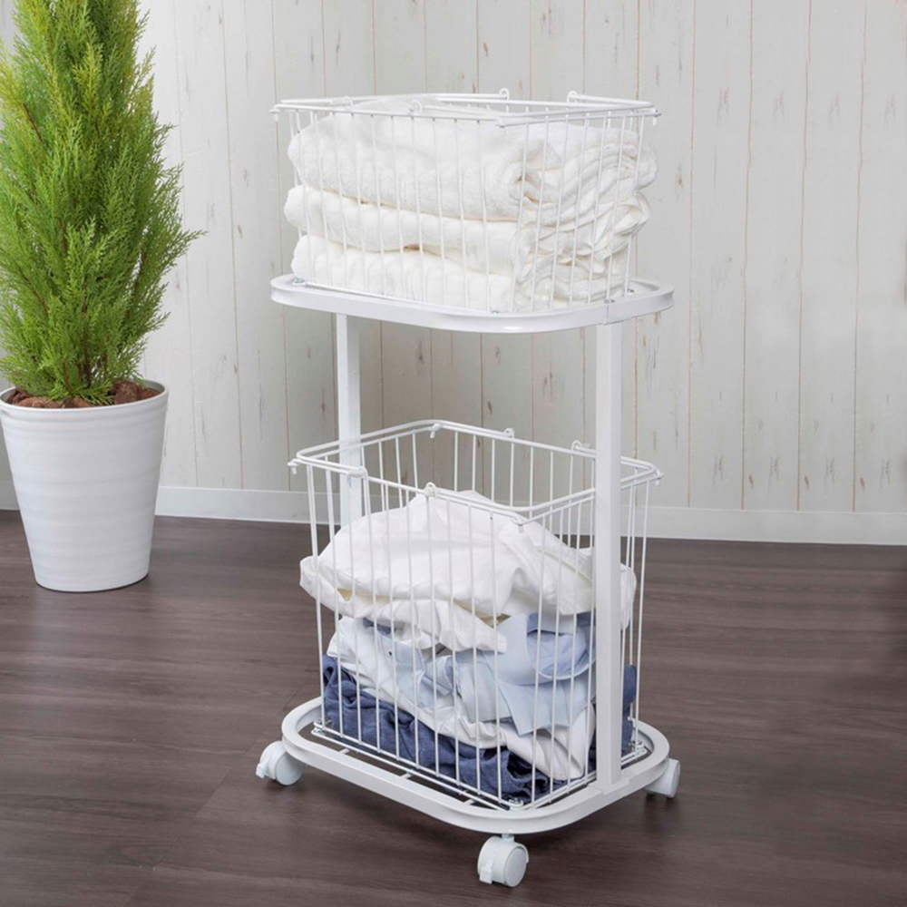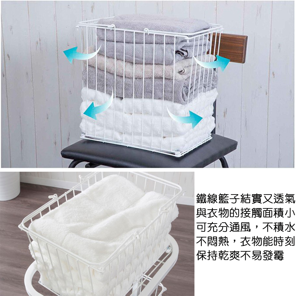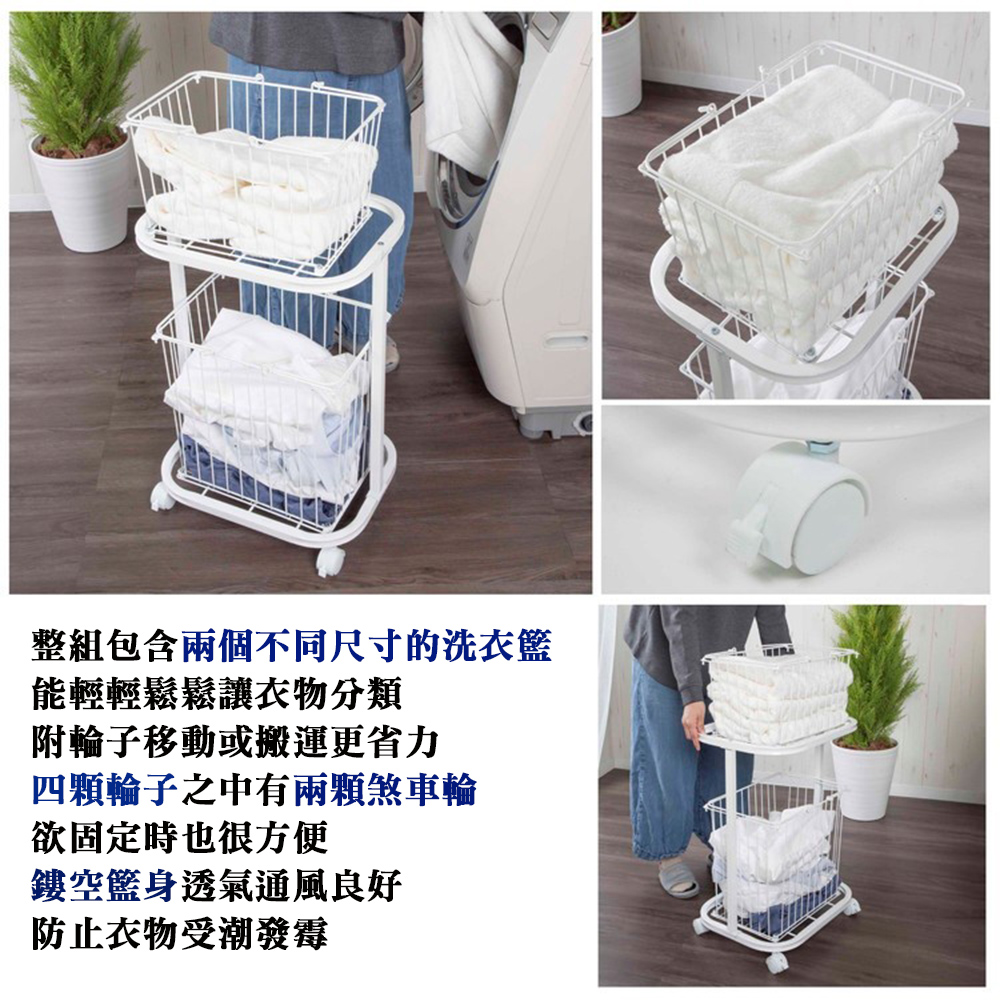 台灣生產外銷日本的洗衣籃車,上下各有一個不同尺寸的鐵籃子,利用鐵籃通風透氣良好的特性,最適合當做髒衣籃或洗衣籃,無論是待洗的衣物或已洗好的衣物都適合暫時收納,具活動輪便於移動與搬運,兩層式設計節省空間,是居家便利的好幫手。