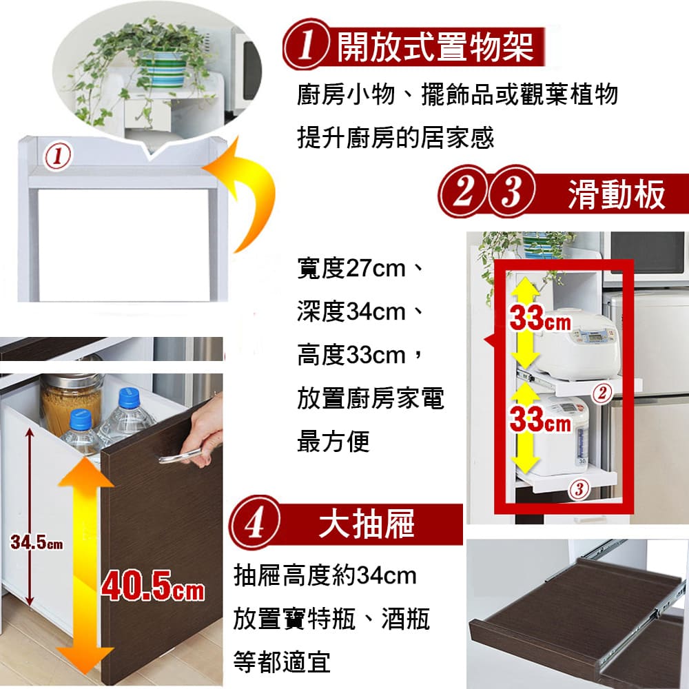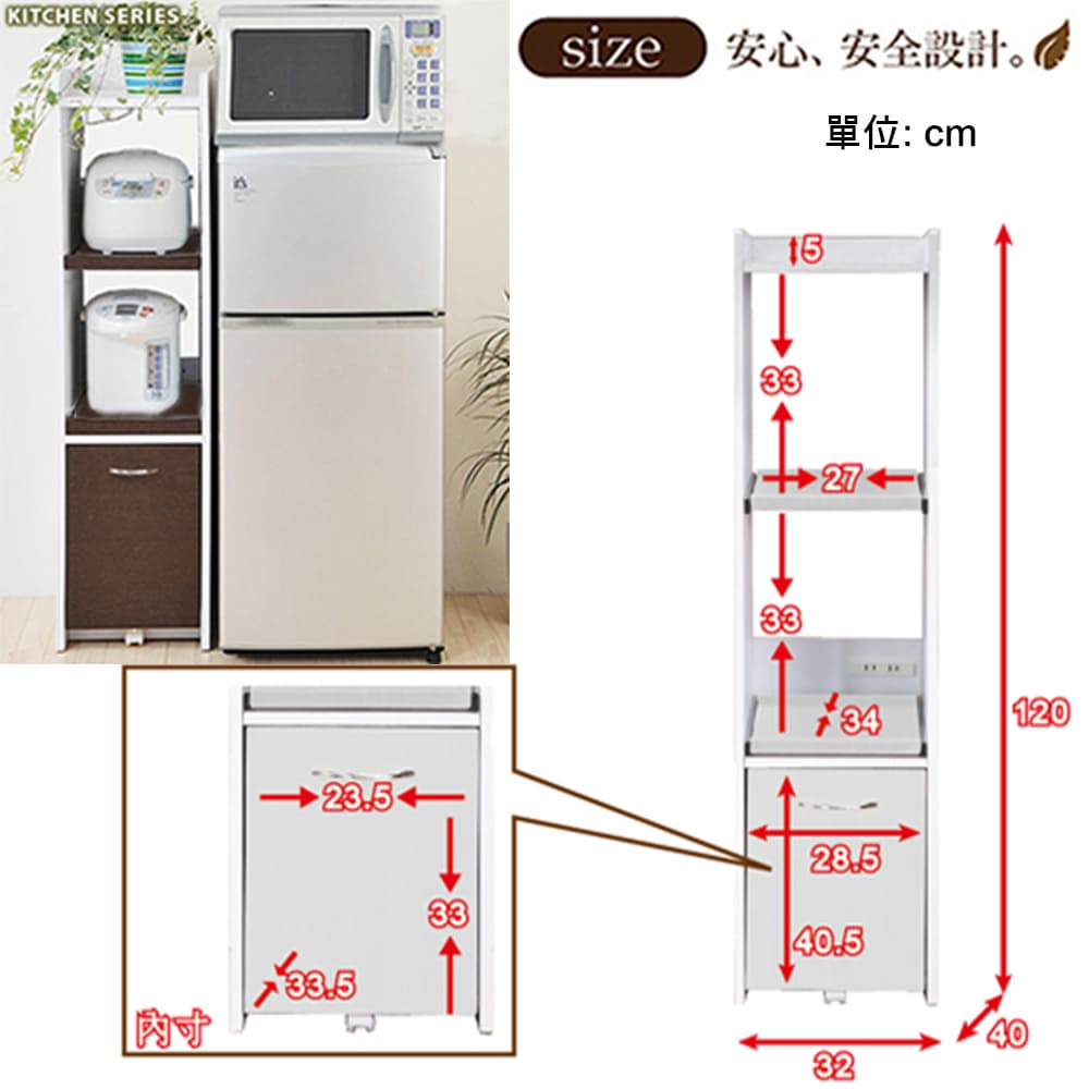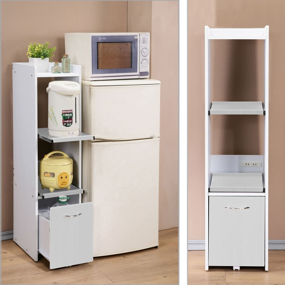 《台所》一般型廚房隙縫電器櫃,共具有兩個推拉式活動平台置物板,方便您放置電子鍋、熱水瓶或小烤箱等廚房家電。活動置物板是採用具煞車功能且堅固耐用的鋼珠滑軌,能夠承受家電的重量,也不會像滾輪滑軌一樣會有掉落下來的危險。此外,為了方便您使用電器,我們也在商品的後方設計了符合日本安規的1500W延長線,共具兩個安全插座,讓您在使用電器的時候不用麻煩的牽就牆壁上的插座位置,不僅是貼心設計,連使用安全都幫您注意到了!