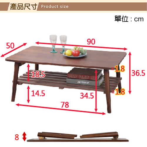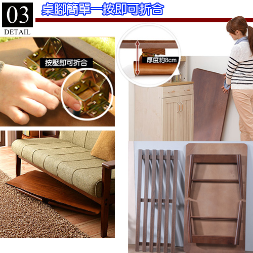 不使用時可以折疊收納是本商品最大的特色,暫時不使用本商品時能夠取下桌下的置物棚架並將桌腳折合,以便於本商品的移動與收納,折合後的厚度只有大約8cm,完全不占空間,角落或床下椅子下方都能收納,使用最靈活。