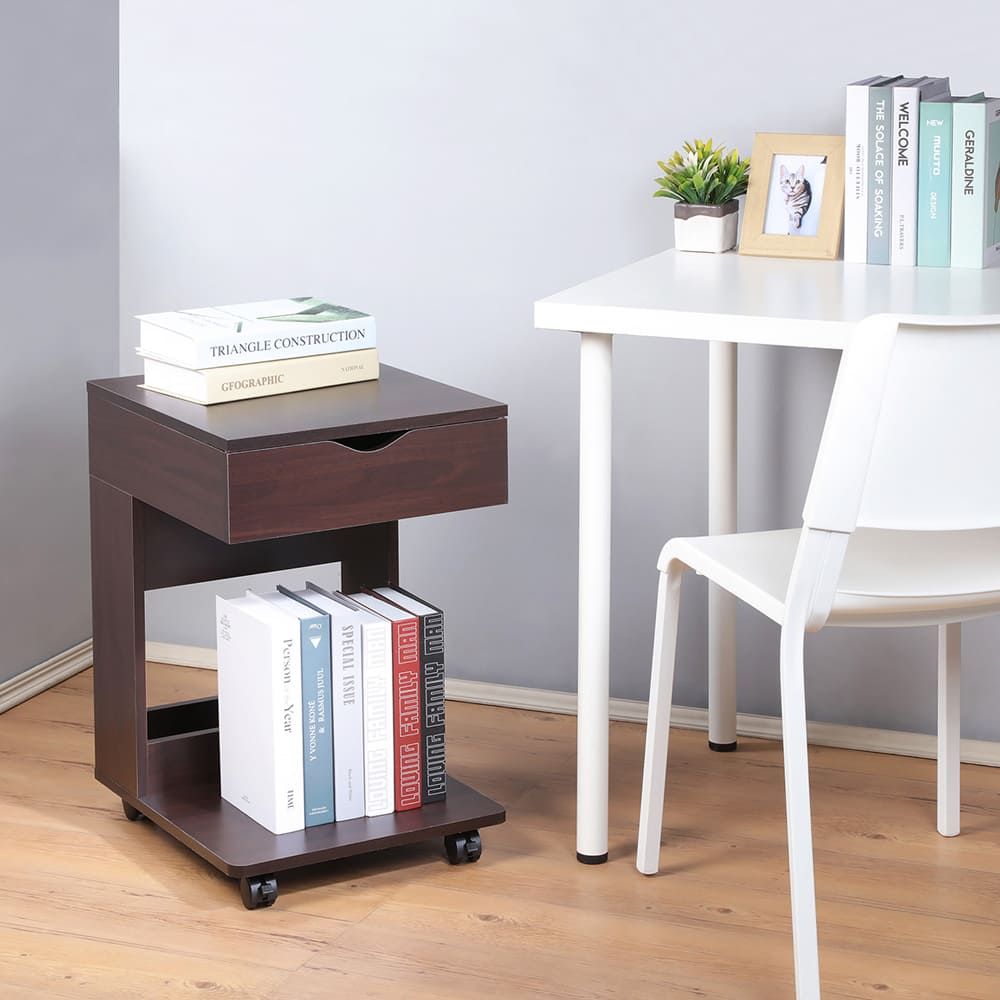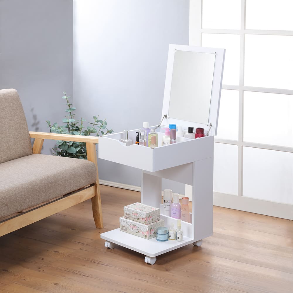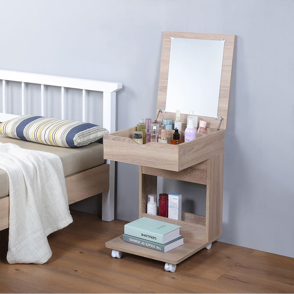兩種使用方式可依您的需求裝上活動輪或者直接置地使用ㄈ字形的獨特設計讓底板可以直接進去床底或沙發底下,當您在床上或沙發上也能身體靠近地使用本商品,雖然原始的設計是化妝櫃但也十分適合做為床邊桌或沙發邊桌