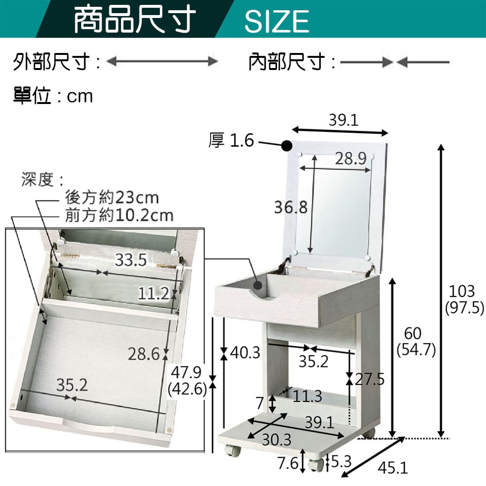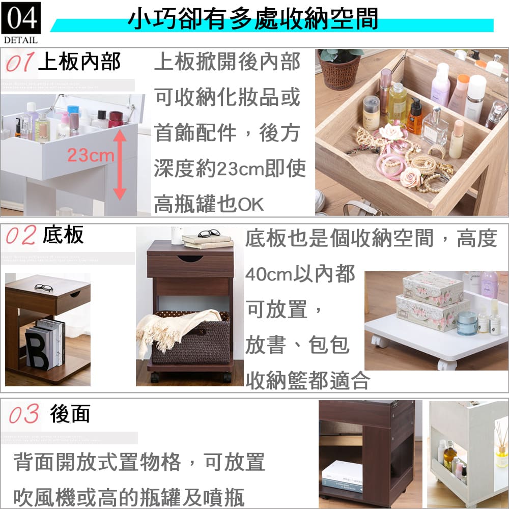 上板掀開來內部有一深一淺的收納空間,想收納高的瓶罐也不怕;底板也是一個高度有40cm的置物板;後方更設計了置物格讓日式的多機能設計完全展現,化妝櫃、桌邊櫃、邊桌都很適合喔,貼心免組裝完成品出貨,收到商品不必大費周章組裝開箱即可使用,適合怕麻煩的小資族群。