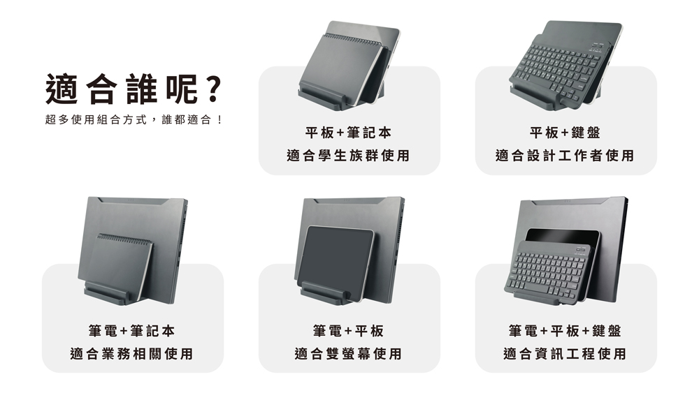 不同於傳統的單一用途筆電架,這款 二合一筆電架適用於多種設備,不管是筆電、平板、鍵盤還是筆記本,都能輕鬆收納,甚至可以同時擺放3台設備,確保桌面整潔有序。