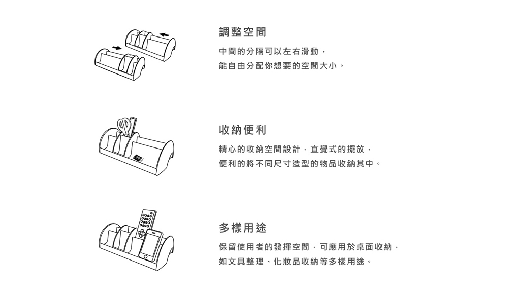 多樣用途  保留使用者的發揮空間,可應用於桌面收納. 如文具整理、化妝品收納等多樣用途。