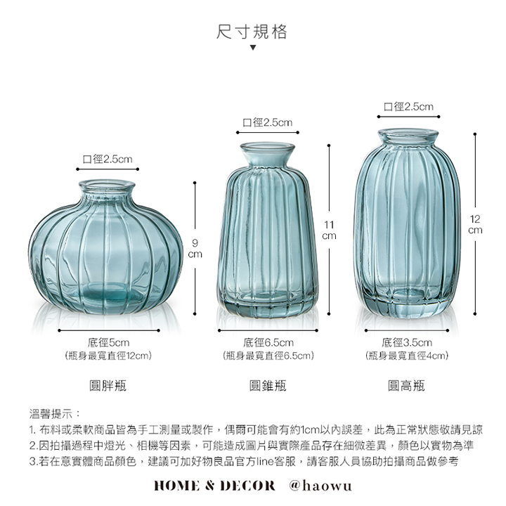 圓胖瓶:口徑2.5×9(h)cm、 圓高瓶:口徑2.5×12(h)cm、 圓錐瓶:口徑2.5×11(h)cm