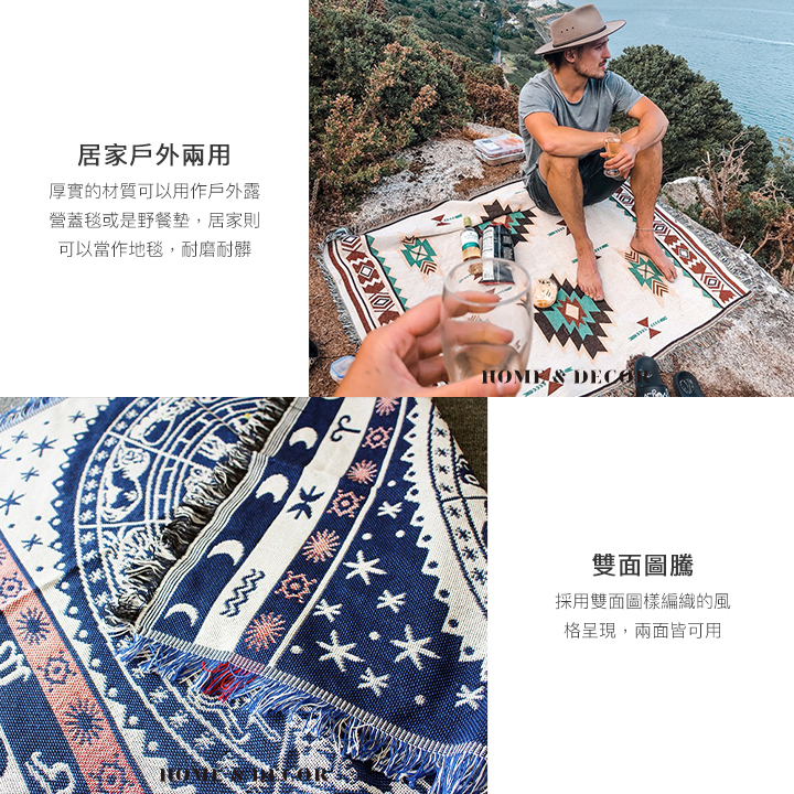 • 居家戶外兩用-厚實的材質可以用作戶外露營蓋毯或是野餐墊、居家則可以當作地毯,耐磨耐髒