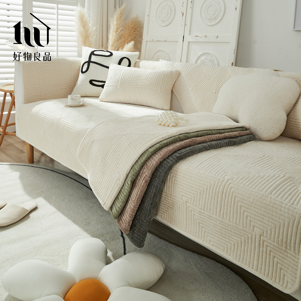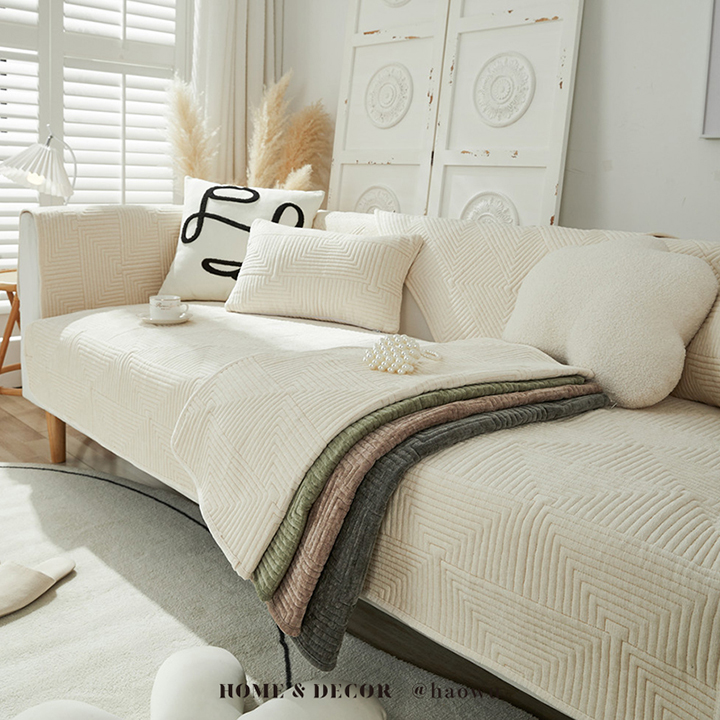 四季通用厚感雪尼爾親膚系列《日式米白》立體防滑刺繡沙發墊組合