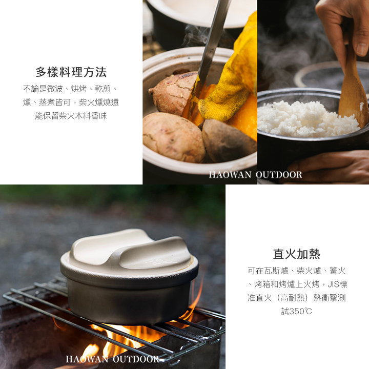 • 直火加熱-可在瓦斯爐、柴火爐、篝火、烤箱和烤爐上火烤,JIS標准直火(高耐熱)熱衝擊測試350℃