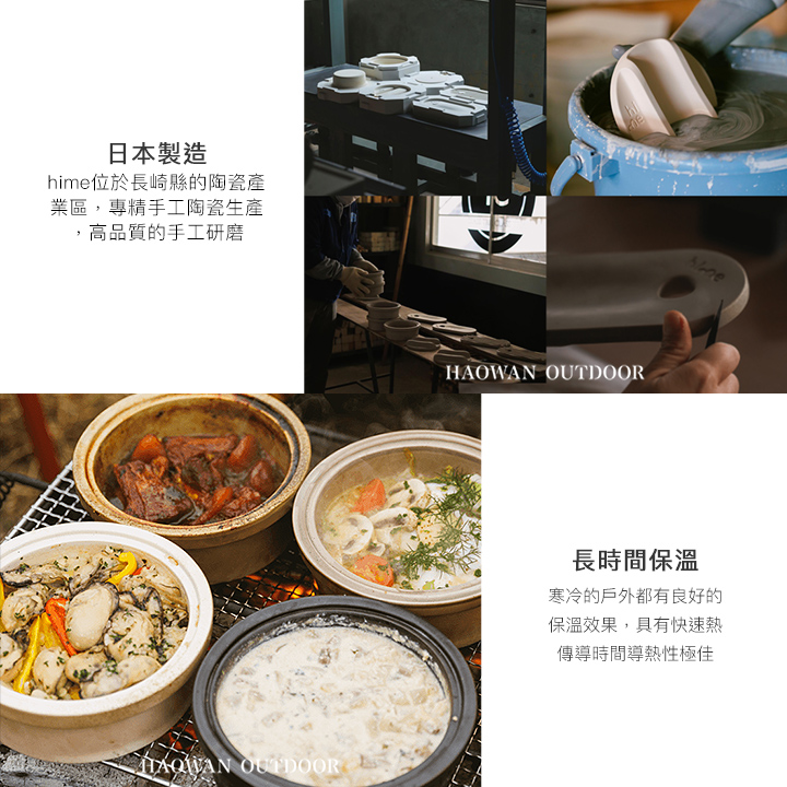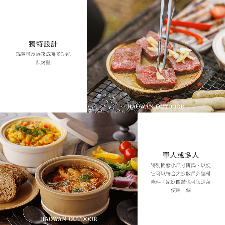 • 單人或多人-特別開發小尺寸陶鍋,以便它可以符合大多數戶外攜帶條件,家庭團體也可每道菜使用一個