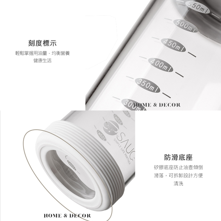• 防滑矽膠底座-不用擔心油壺傾倒滑落。可拆卸設計,讓你清洗更方便乾淨