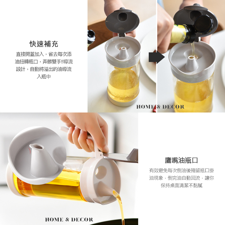 • 鷹嘴油瓶口設計-有效避免每次倒油後殘留瓶口掛油現象,倒完油自動回流,讓你保持桌面清潔不黏膩