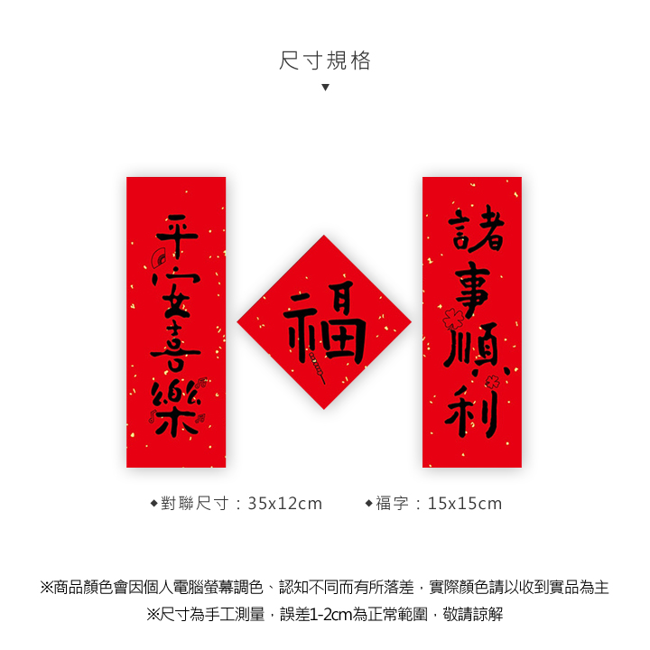 對聯:35×12cm ;福字:15×15cm
