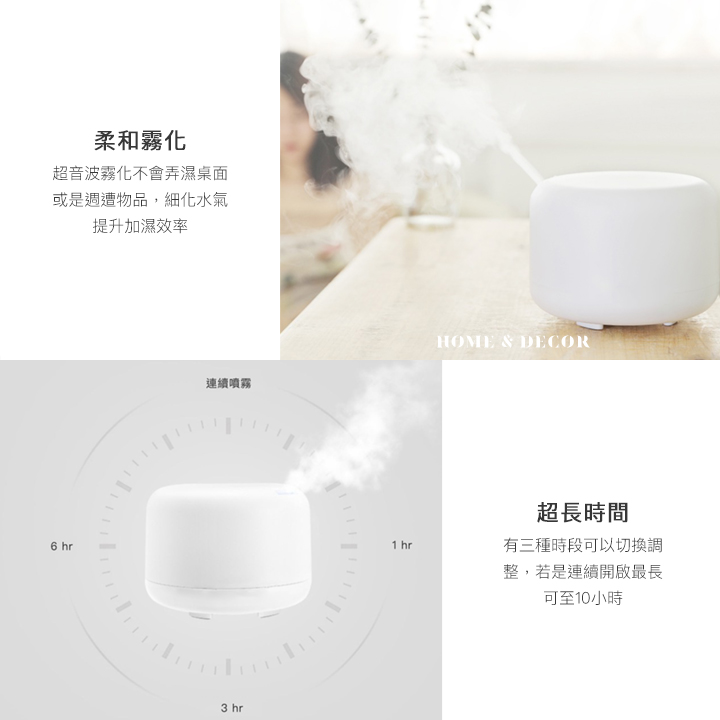 • 柔和霧化-超音波霧化不會弄濕桌面或是週遭物品,細化水氣提升加濕效率。
