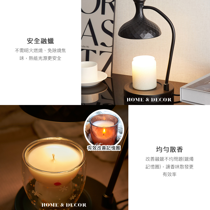 • 安全融蠟-不需明火燃燒、免除燒焦味,熱能光源更安全