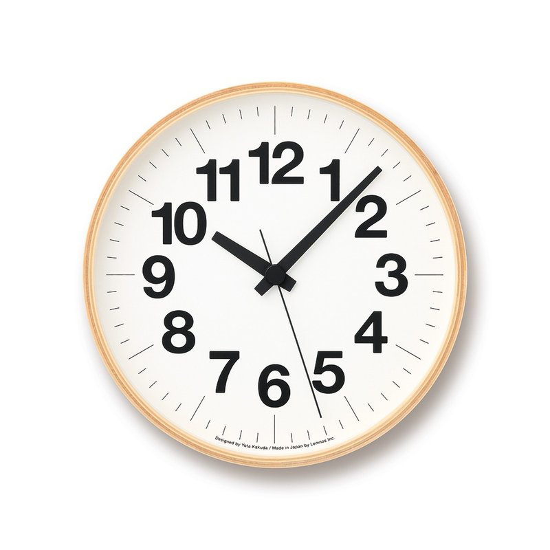 由無印良品及JINS眼鏡的設計師角田陽太設計。Numbers PLY有12個磊落大方的數字轉配上白色鐘面以及原木鐘匡為極簡設計感。由Lemnos富山縣高崗市製鐘工匠手製。