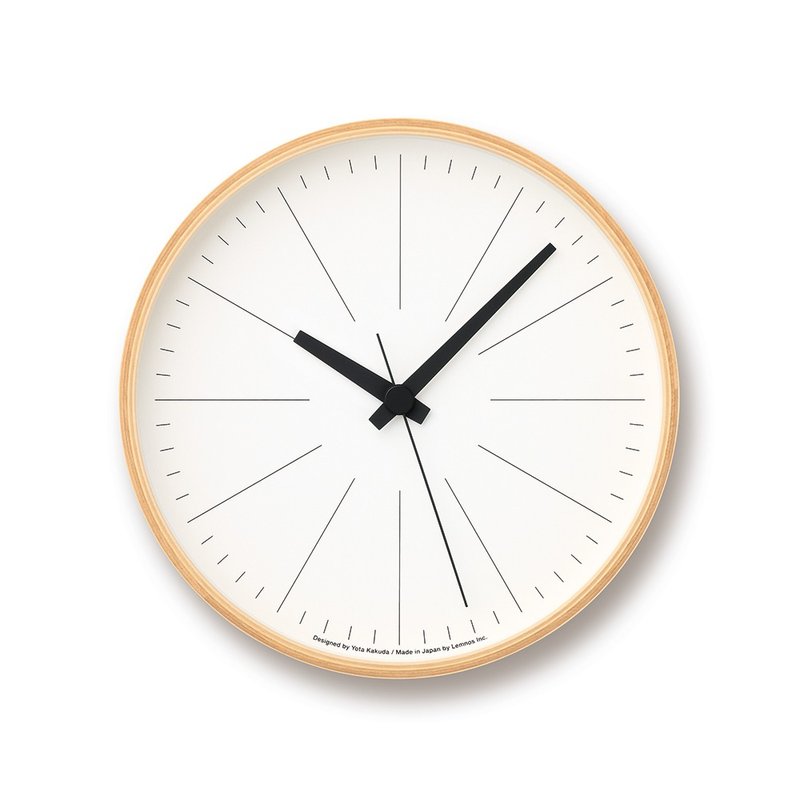 由無印良品及JINS眼鏡的設計師角田陽太設計。Lines PLY有12個線條轉配上白色鐘面以及原木鐘匡為極簡設計感。由Lemnos富山縣高崗市製鐘工匠手製。