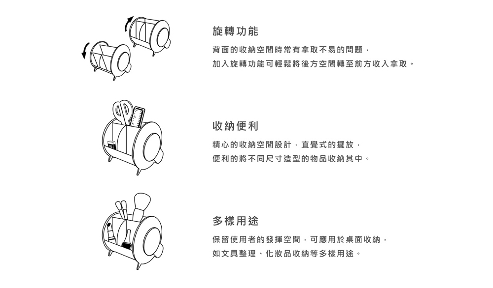 多樣用途 保留使用者的發揮空間,可應用於桌面收納. 如文具整理、化妝品收納等多樣用途。